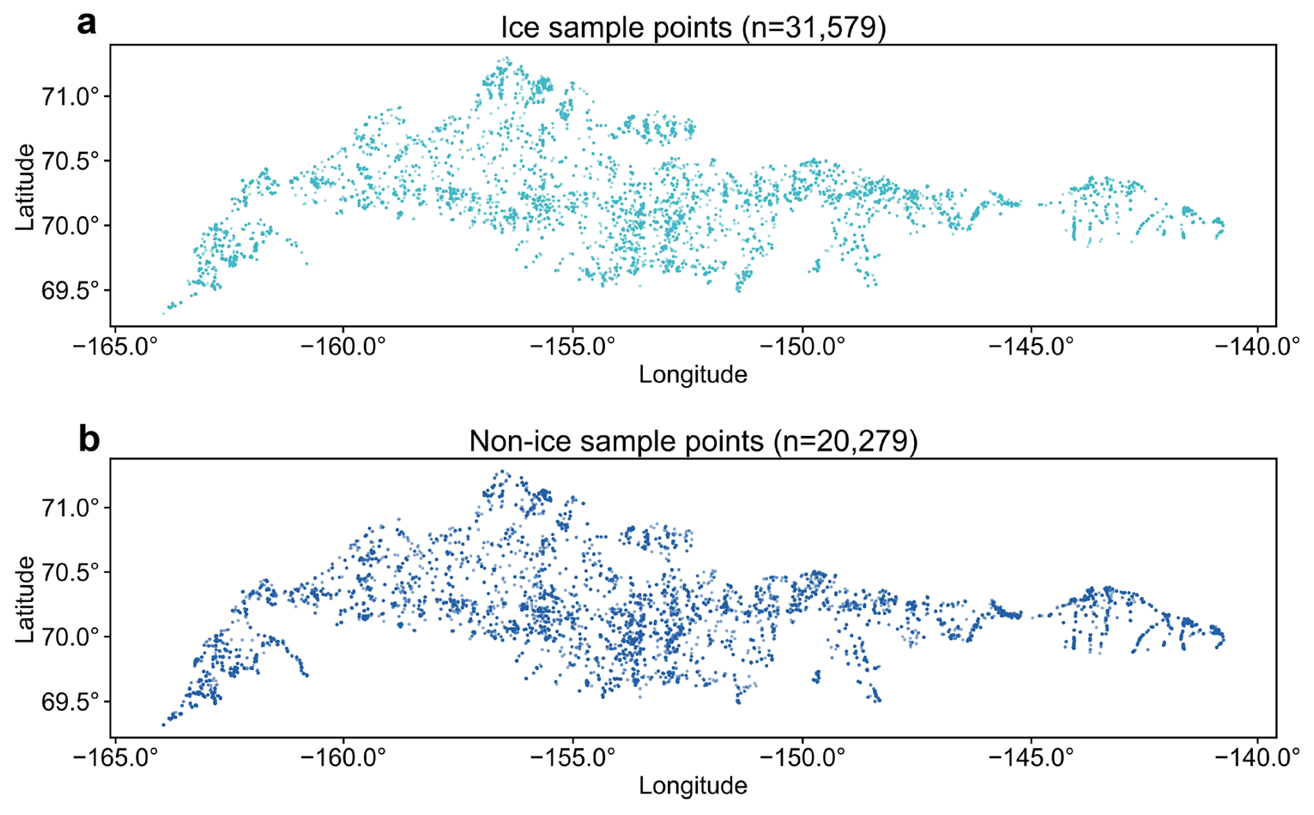 In total, we collected 51 858 samples, consisting of 31 579 ice samples and 20 279 non-ice samples (Fig. 3). Of these, 19 124 samples (11 466 ice and 7658 non-ice) were from ascending orbit scenes, and 32 734 samples (20 113 ice and 12 621 non-ice) from descending orbit scenes. We separated the ascending and descending orbit samples to develop independent ice detection models for each orbit.