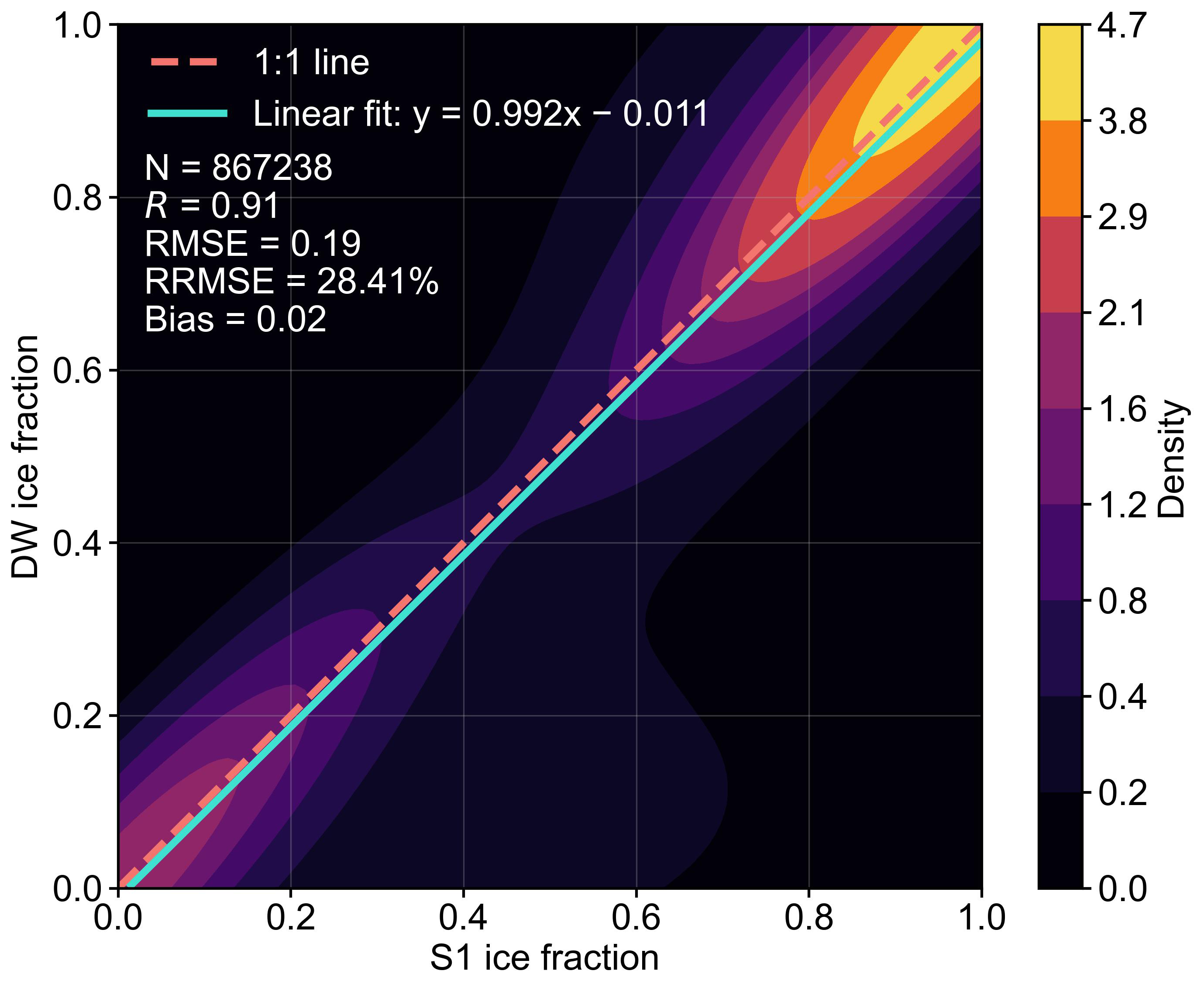 Quantitative comparisons showed high consistency between the 1 km S1 and DW ice fraction results, with an R of 0.91, RMSE of 0.19, RRMSE of 28.41 %, and a bias of 0.02 (Fig. 5). The S1 ice fraction shows a slight overestimation relative to DW in low-value areas, such as when the ice fraction ranges from 0 to 0.4. However, this overestimation accounts for less than 10 % of the validation data pairs. Annual comparisons from 2017 through 2023 also showed good consistency, with R values ranging from 0.86 to 0.94, RMSE between 0.13 and 0.22, RRMSE between 0.16 and 0.38, and bias ranging from −0.02 to 0.05 (Table S4 in the Supplement).