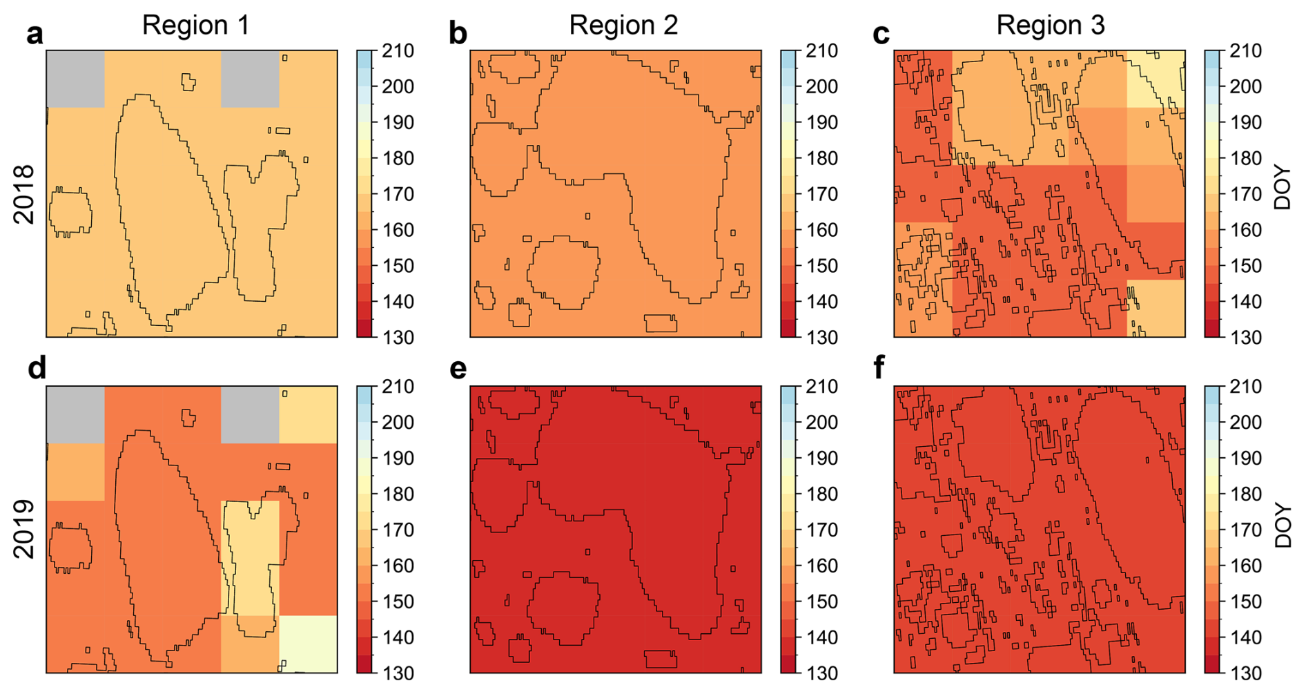 Figure 7The lake ice break-up dates in 2019 (d–f) were generally earlier than those in 2018 (a–c) across the three selected regions in the ACP (Fig. 1). Each subplot shows a 5 km×5 km area where water bodies are delineated by black lines. The phenology dates are calculated based on 1 km S1 ice fraction data, and the color of each 1 km grid cell indicates the break-up date in day of year (DOY).
