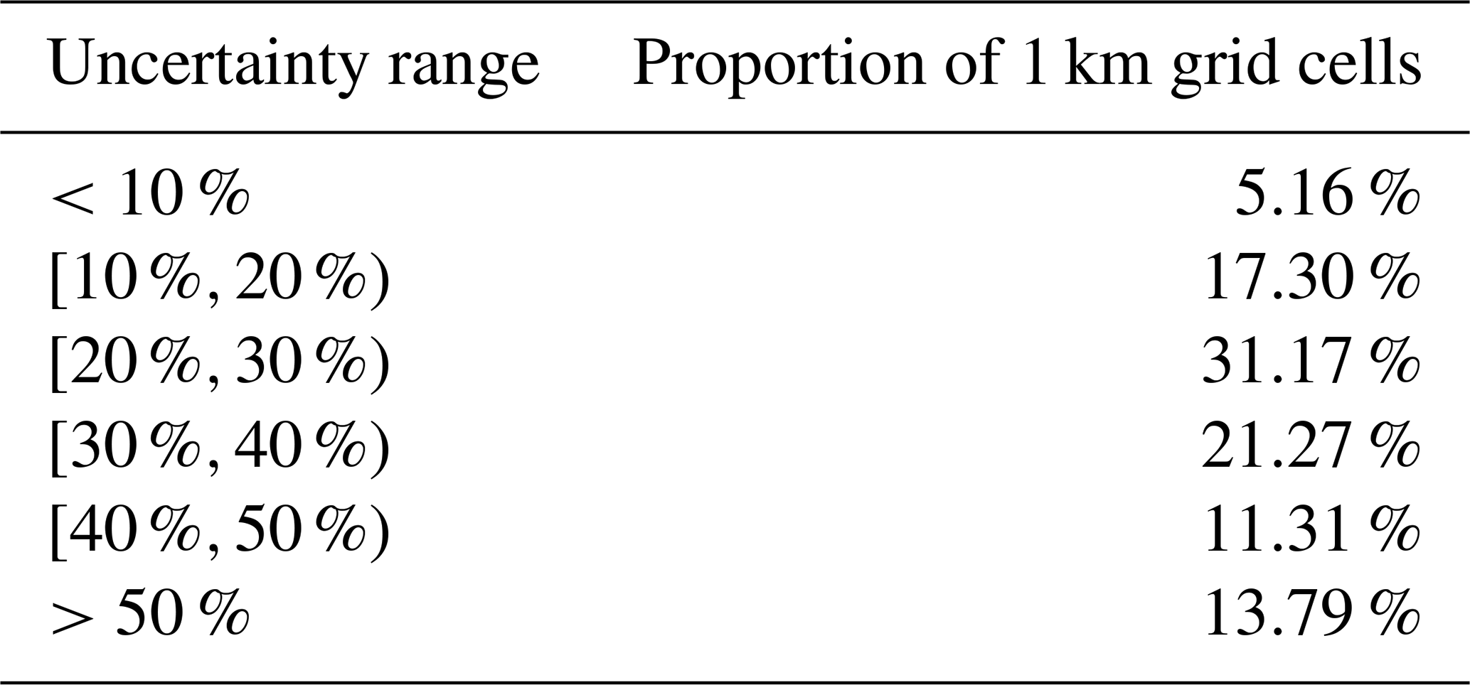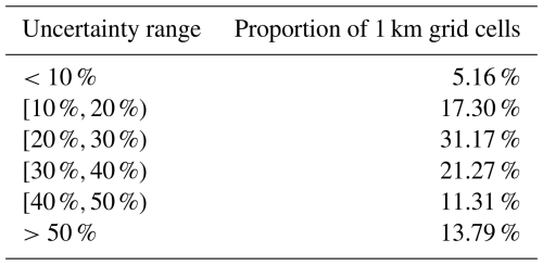 The uncertainty of the S1 ice fraction dataset for each 1 km grid cell was evaluated using RRMSE. About 5.16 % of the 1 km grid cells have an RRMSE below 10 %, indicating that in these areas the model achieves high accuracy, with predictions closely matching the DW ice fraction (Table 1). An additional 17.30 % of the data fall within the 10 %–20 % range, reflecting good model performance (Table 1). The largest portion of the dataset, 31.17 %, lies in the 20 %–30 % range, indicating moderate accuracy for a substantial part of the ice fraction predictions (Table 1). Furthermore, 21.27 % of the data are within the 30 %–40 % range, showing areas with larger errors. In addition, 11.31 % of the data have RRMSE values between 40 %–50 %, and 13.79 % exceed 50 %, highlighting regions where the model performs poorly. For these high-error areas, users should exercise caution and can filter them using the provided quality layer. Relatively high errors were mainly found along rivers as well as in very small water bodies, where mixed land and water/ice conditions are likely found in S1 observations (Fig. S2). For example, among the 1 km grid cells with RRMSE greater than 60 %, 46.7 % areas are distributed in river areas determined by a 1 km buffer around the river centerlines. Contaminations in S1 observations from the surrounding land areas of the elongated or very small water bodies likely led to the large classification uncertainties.