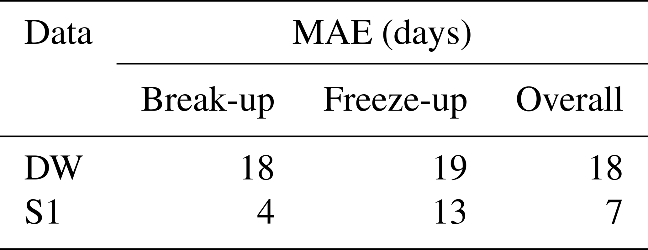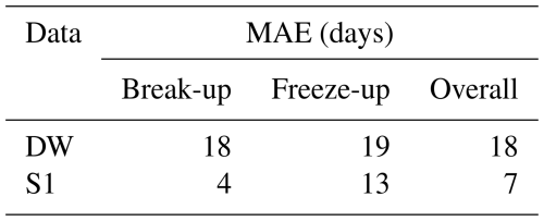 Table 2Errors in ice phenology dates estimated from 1 km S1 and DW ice fraction data. Errors are presented as mean absolute error (MAE), calculated based on the results in Table S1. The table includes MAE for break-up dates, freeze-up dates, and overall MAE.