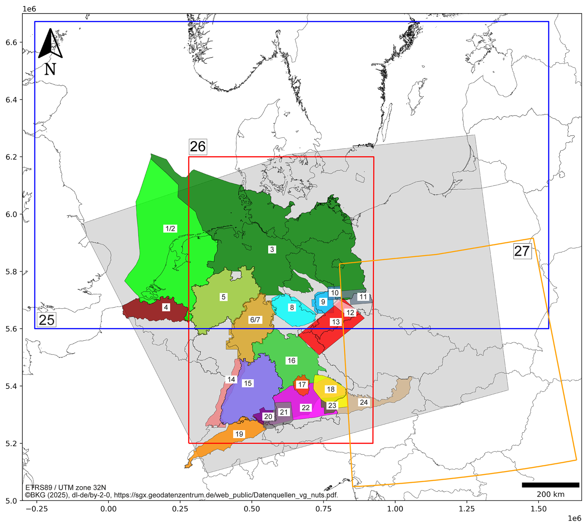 Figure 1Overview of model area and 3D geological models used: Grey area: Model area. 1/2: Netherlands (TNO, 2019a, b), 3: TUNB (BGR et al., 2022), 4: Vlaanderen (Deckers et al., 2019), 5: Landesmodell NRW (Geologischer Dienst NRW, 2022), 6/7: Hessen (Bär et al., 2021; Weinert et al., 2022), 8: Thueringer Becken (TLUBN, 2014), 9: NW-Sachsen (Görne, 2011), 10: SN Zwischengebiet (Görne, 2012b), 11: Niederlausitz (Görne and Geißler, 2015), 12: Elbtalzone (Görne, 2012a), 13: Erzgebirge (Kirsch et al., 2017), 14: GeORG (GeORG-Projektteam, 2013), 15: Landesmodell BW (Rupf and Nitsch, 2008), 16: Geothermieatlas BY (LfU, 2022), 17: Ingolstadt (Ringseis et al., 2020b), 18: Niederbayern (Donner, 2020b), 19: GeoMol Swiss (Swisstopo, 2019), 20: GeoMol LCA BW (GeoMol LCA-Projectteam, 2015a), 21: GeoMol LCA BY (GeoMol LCA-Projectteam, 2015b), 22: GeoMol FWM BY (GeoMol Team, 2015b), 23: GeoMol UA-UB BY (GeoMol UA-UB-Projectteam, 2015), 24: GeoMol Austria (Pfleiderer et al., 2016), 25: CEBS (Maystrenko and Scheck-Wenderoth, 2013), 26: 3DD (Anikiev et al., 2019), 27: LSCE (Tašárová et al., 2016); The original model names are listed in Table S3; here, short names are used. Coastlines and borders used in this figure are based on the Global Self-consistent Hierarchical High-resolution Geography (GSHHG) of Wessel and Smith (1996).