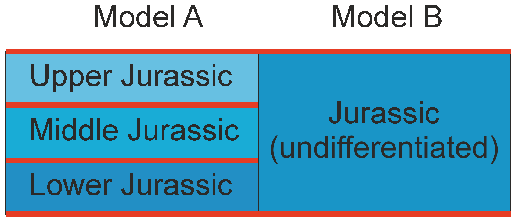 Figure 2Sketch illustrating challenge of unit definition of models with different vertical (stratigraphic) resolution. Four units (blue boxes) are defined by four formation interfaces (red lines) of two models. Detailed description see text (Reiter et al., 2023).