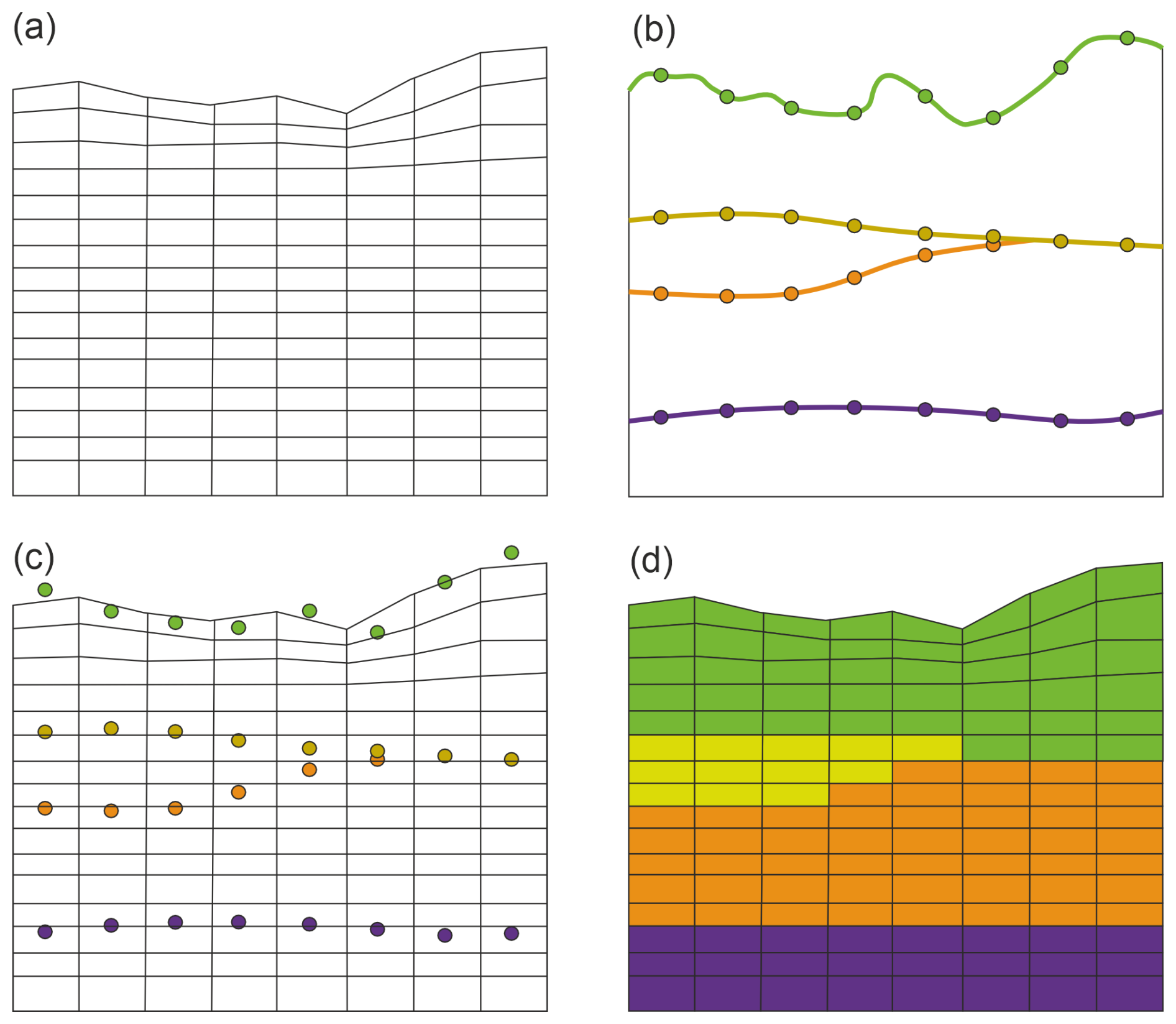 Figure 5Sketch of the ApplePY approach (Ziegler et al., 2020b) based on Ziegler et al. (2020a) combining a mesh (a) with a structural model provided as point set data (b, c) to define model units (d). Details are described in the text.