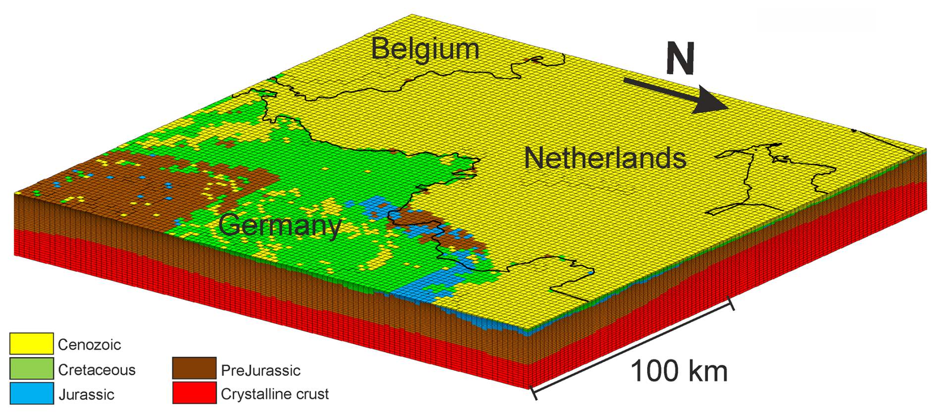 Figure 6Discretized model created with data sets of Ahlers (2026) and ApplePY (Ziegler et al., 2020b) visualized with Tecplot. The uppermost unit “Relicts” is removed. The model area is located at the triangle of countries of Belgium, Germany and the Netherlands: y(min)=5 650 000, y(max)=5 850 000, x(min)=200 000, x(max)=400 000. The base of the model is at a depth of 20 km. Coastlines and borders used in this figure are based on the Global Self-consistent Hierarchical High-resolution Geography (GSHHG) of Wessel and Smith (1996).
