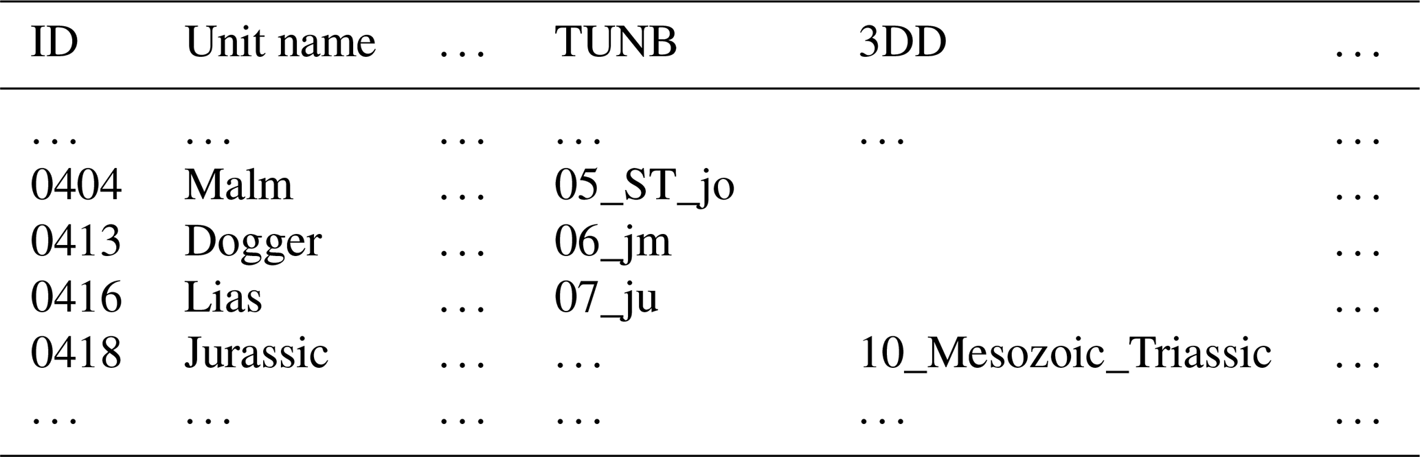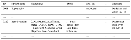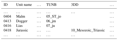 Based on the stratigraphic correlation, we defined the final model units. The results are summarized in a second table (Table S2); an excerpt is shown in Table 2. The structure is similar to Table S1 and the excerpt shows the same simple example as shown in Fig. 2. Within the TUNB model (BGR et al., 2022; 3) the Jurassic is subdivided into three subunits Lias, Dogger, Malm (Lower, Middle and Upper Jurassic), while in the 3DD model (Anikiev et al., 2019; 26), only one Jurassic unit exists. Therefore, we defined four individual units. In addition to Table S1, we extended the geological categorization of the IDs by: 11xx top crystalline basement, 12xx base upper crust, 13xx base lower crust. Furthermore, we extended categorization of IDs 00xx to 10xx to take into account if several units are defined by one surface (Fig. 2). The final model contains 147 surfaces, i.e., 146 units: 131 sedimentary units, 8 upper crustal units and 7 lower crustal units.