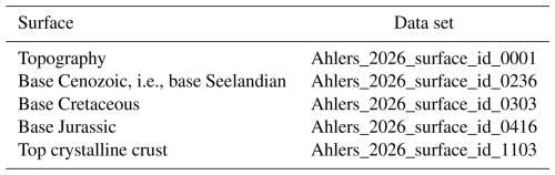 Based on the 27 models (Fig. 1), we defined 89 different surfaces. The result of the stratigraphic correlation is summarized in Table S1 in the Supplement; a small excerpt is shown in Table 1. Each individual surface is listed in one row and is labeled with its ID and surface name. The IDs are categorized as follows: 00xx stratigraphy independent surfaces, 01xx Quaternary, 02xx Cenozoic, 03xx Cretaceous, 04xx Jurassic, 05xx Triassic, 06xx Permian, 07xx Carboniferous, 08xx Devonian, 09xx Variscan nappes, 10xx top basement. In the columns to the right of the surface name, all models used are listed, i.e., if a model contributes data to a surface, it is documented in the corresponding row. Information is given as follows: original file name – surface name (additional information). The rightmost column “Literature” lists if we used literature for the stratigraphic correlation in addition to the model descriptions and the stratigraphic table of Germany (DSK, 2016).