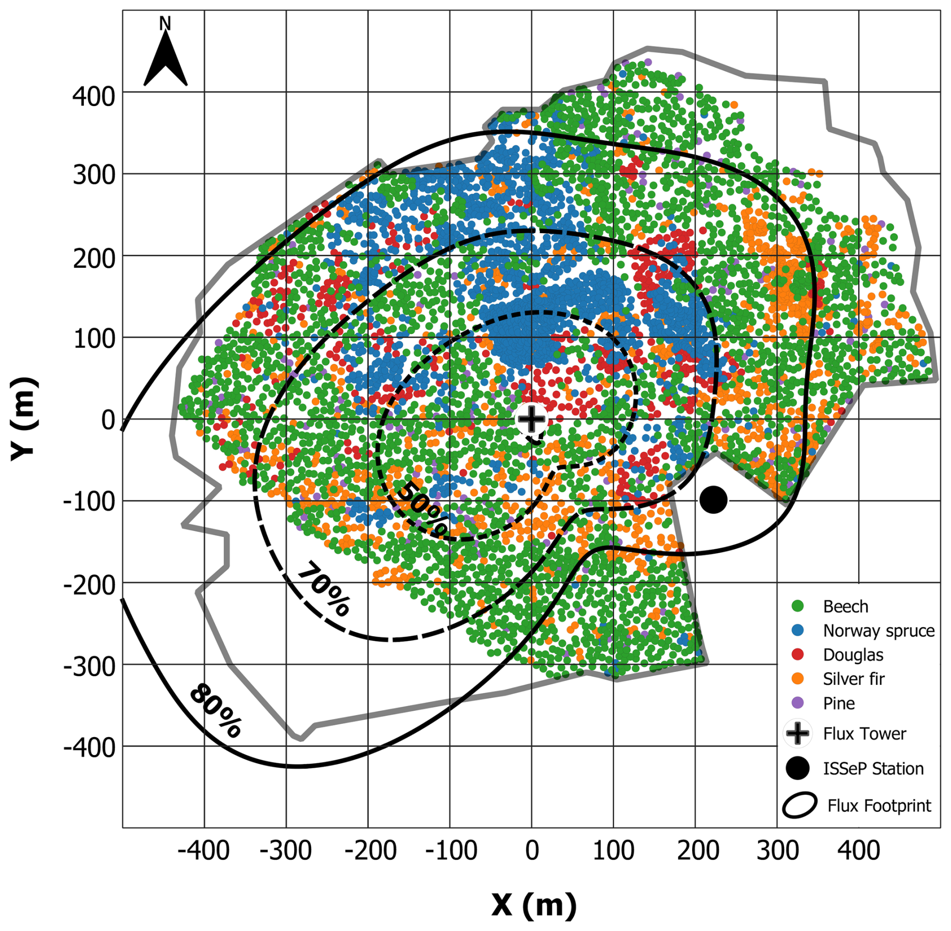 The study site (BE-Vie) is a mature mixed forest ecosystem, located in Vielsalm in the Belgian Ardenne region (50°18′ N, 6°00′ E; altitude 470 m a.s.l.). This site is part of several gas measurement networks: ICOS (class 2 ecosystem station) (https://www.icos-cp.eu/, last access: 13 January 2026), ACTRIS (for particle and gas in situ) (https://www.actris.eu/, last access: 13 January 2026), and EMEP (level 1 station) (https://www.emep.int/, last access: 13 January 2026). Its climate is temperate maritime and the 50-100 cm deep soil is classified as a dystric cambisol. The vegetation within the target area (that is, the area that contributes the most to fluxes measured at the flux tower) is a mixture of coniferous species, mainly Norway spruce (Picea abies [L.] Karst., mean height 17 m), Douglas fir (Pseudotsuga menziesii [Mirb.] Franco, 37 m) and Silver fir (Abies alba Miller, 26 m); and deciduous species, mainly European beech (Fagus sylvatica L., 22 m). Tree heights are reported from the last extensive inventory in the surroundings of the flux tower (2019), yielding an overall mean tree height of 26 m. Besides tree saplings, the understory vegetation is very sparse and is mainly composed of mosses (∼ 76 % of the understory vegetation in dry weight), shrubs (∼ 15 %, mainly Vaccinium myrtillus [L.] and Rubus species), and ferns (∼ 8 %). Figure 1 gives a distribution of dominant tree species in most of the target area. This classification is based on multispectral images acquired with a drone in 2018 (Lanssens, 2019). The dominant winds blow from the south-west (sector dominated by European beech) and the north-east (sector dominated by Norway spruce and Douglas fir). The footprint climatology was obtained using the model by Kljun et al. (2015) and is shown in Fig. 1. Within the 70 % cumulative footprint, the distribution of tree species is dominated by Norway spruce (38 %) and European beech (36 %), followed by Silver fir (14 %), Douglas fir (9 %), and Scots pine (2 %).