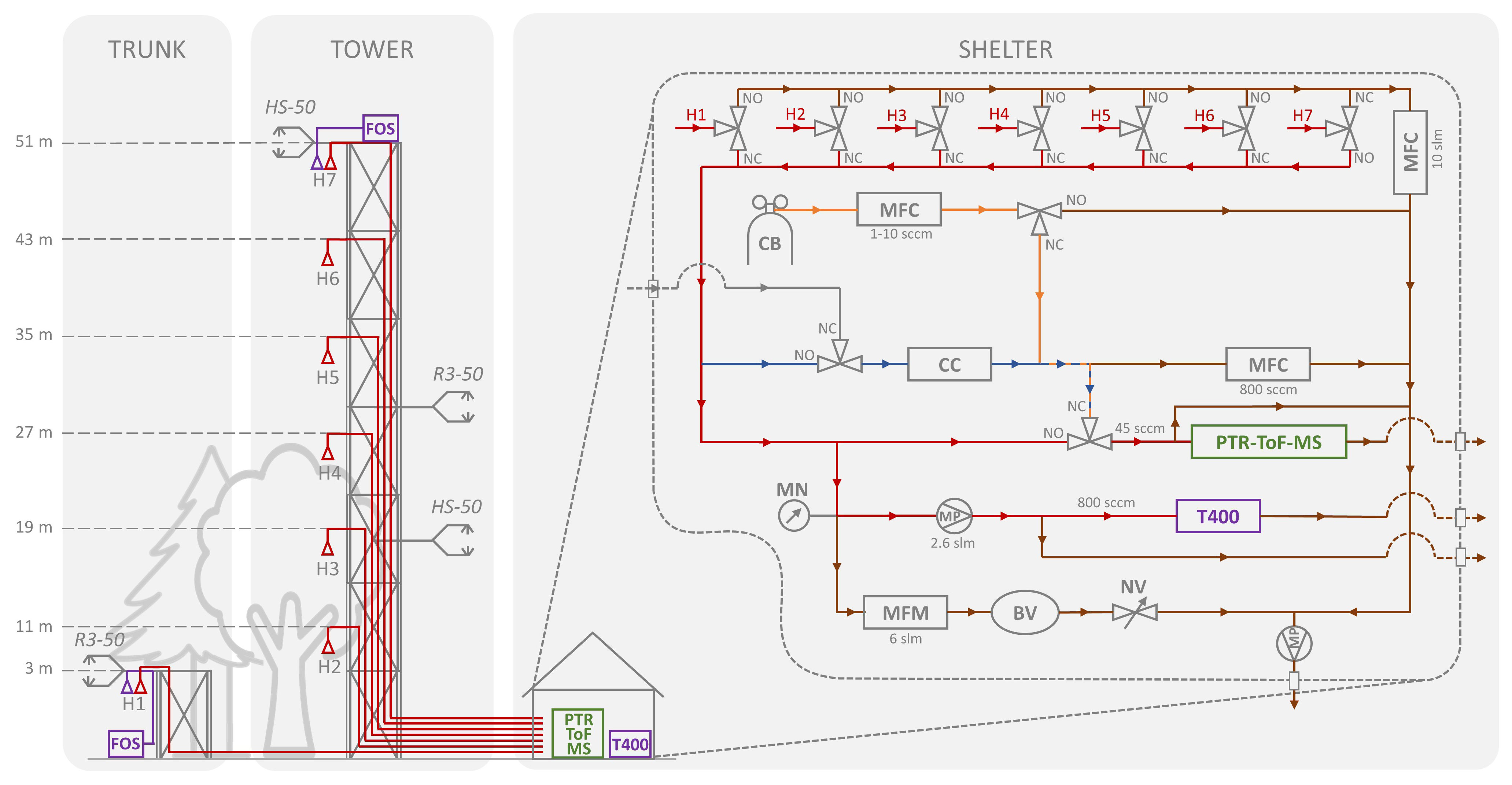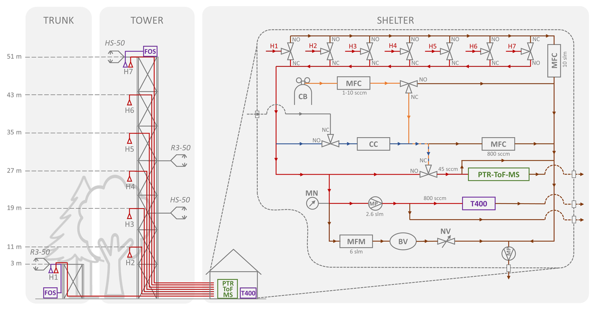 Figure 2Schematic representation of the concentration and sonic anemometer profile setup, including a zoom on the pneumatical system. Instruments include: FOS – fast ozone analyser; T400 – slow ozone analyser; PTR-ToF-MS – fast VOC analyser; HS-50 & R3–50 – sonic anemometers; CB – calibration bottle; MFC – mass flow controller; CC – catalytic converter; MN – manometer; MP – membrane pump; MFM – mass flow meter; BV – buffer volume; NV – needle valve. Line colours indicate function: purple – ozone line, red – ozone/VOC line, blue – background line, orange – calibration line, brown – exhaust line. The positions of the solenoid valves are indicated by NO (normally open, i.e. open without electrical activation) and NC (normally closed, i.e. open only when electrically activated).