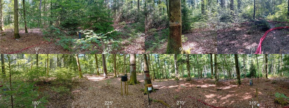 The lowest level of the VOC/O3 profile (H1, see Sect. 2.2.3) was located on a 3 m high mast installed in 2022 in the European beech sector, approximately 10 m west of the tower. Ambient air was sampled through a 60 m long tube leading to the shelter. In 2023, a second FOS instrument (5 m long and 6.4 mm inner-diameter PFA tube, flowrate of 3.5 SLM) and a 3D R3-50 sonic anemometer (Gill Instrument Ltd, UK) were added to the 3 m mast to establish a system compatible with EC measurements. This configuration, referred to as the TRUNK system, samples air from within the trunk space of the forest, primarily to characterize the VOC and ozone fluxes exchanged by the soil. However, a small part of this space is occupied by young woody vegetation, shrubs, mosses and ferns, as shown in Fig. 3.