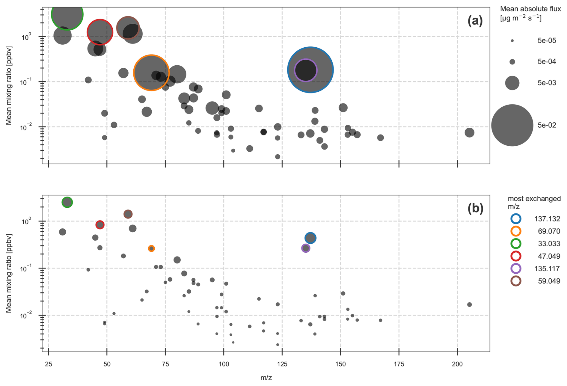 The mass scale was calibrated in the IDA software every 60 s and peak-shapes were considered stable over the course of 1 h. Independent peak identification was performed for each IDA analysis with up to 8 values identified per peak system (collection of isobaric peaks with the same nominal mass). A peak system was only considered for analysis if its maximum ion signal intensity exceeded 0.1 cps. To obtain a list of non-targeted ratios, Density-Based Spatial Clustering of Applications with Noise (Ester et al., 1996), or DBSCAN, was employed to identify mass-to-charge ratios where peaks were regularly observed. An automated selection of ion values has been performed based on (i) the width of the DBSCAN intervals centred around the mass (stability of peak identification by IDA), (ii) the fraction of data above the limit of quantification (significance of concentrations), and (iii) the localization (interpretability of the data). Afterwards, a manual selection to discard values related to isotopes or hydrated ion species was done. Compound attribution was performed by making use of PTR-MS databases (Pagonis et al., 2019; Yáñez-Serrano et al., 2021) and measurements reported at ecosystem sites (Kim et al., 2010; Hellén et al., 2018; Schallhart et al., 2018; Pfannerstill et al., 2021) to identify the compounds most likely to contribute to the observed signal.
