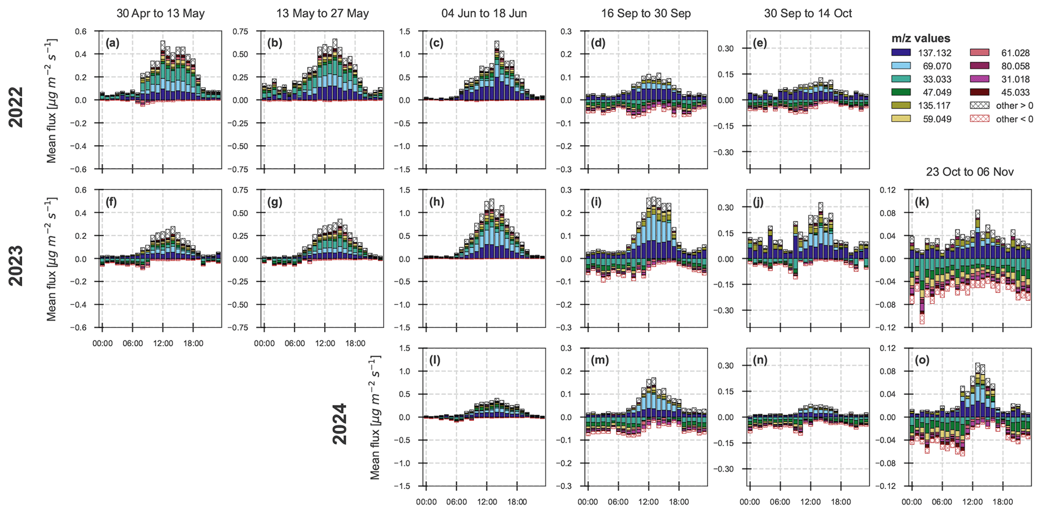 EC fluxes are commonly filtered to remove data collected under low-turbulence conditions, particularly for CO2 fluxes, using a friction velocity (u*) threshold. However, given the different nature of VOC exchange processes compared to CO2, no u* filtering was applied in this study. Additional information and justification for this choice are provided in Sect. S3.1.