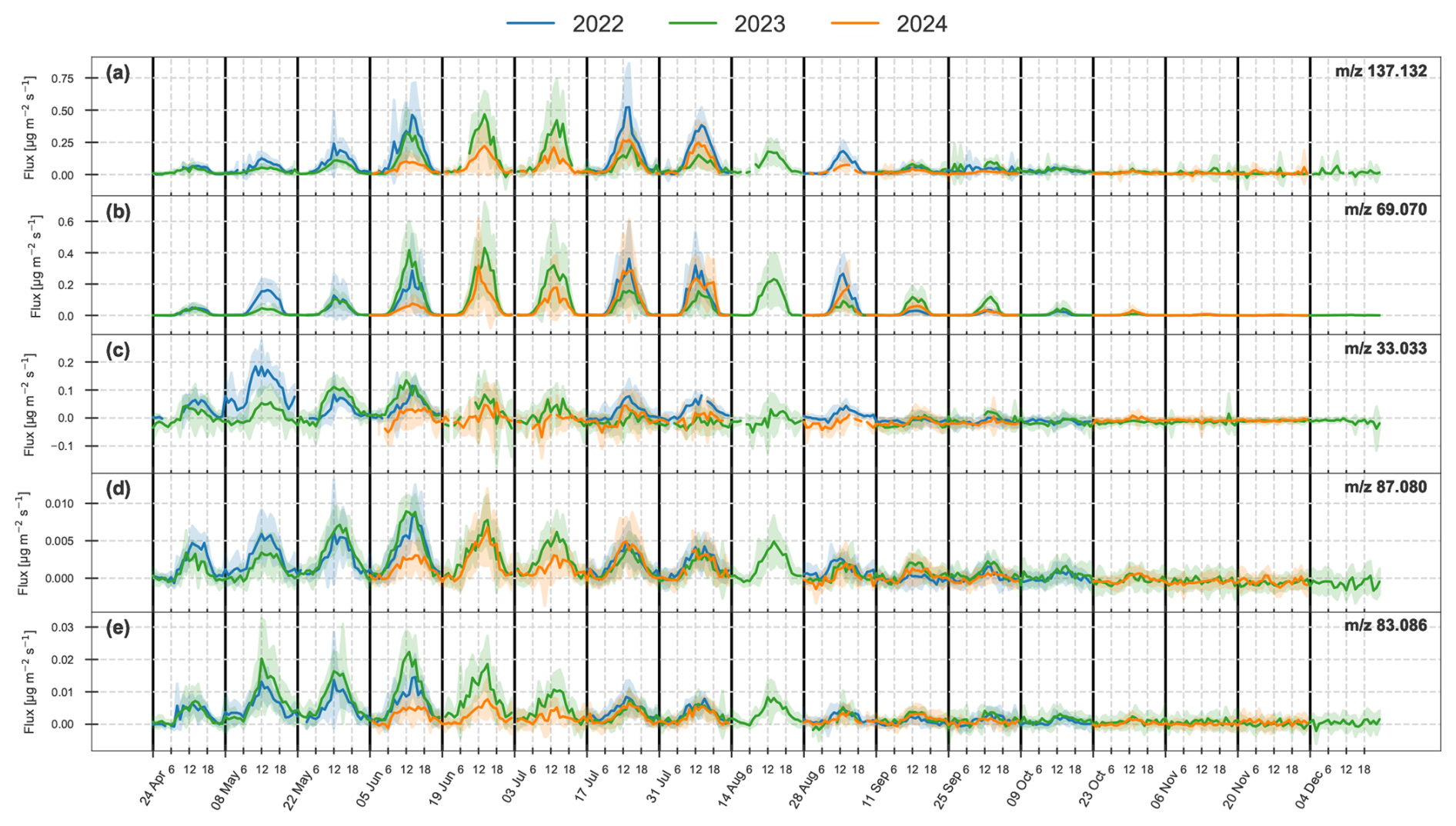 Schallhart, S., Rantala, P., Kajos, M. K., Aalto, J., Mammarella, I., Ruuskanen, T. M., and Kulmala, M.: Temporal variation of VOC fluxes measured with PTR-TOF above a boreal forest, Atmos. Chem. Phys., 18, 815–832, https://doi.org/10.5194/acp-18-815-2018, 2018. a, b, c, d