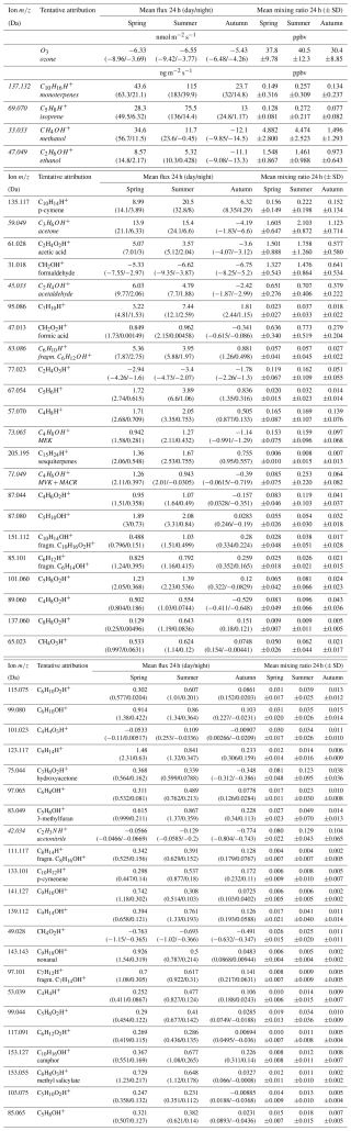 Each year, terrestrial ecosystems emit over 1000 Tg of organic carbon in the form of biogenic VOCs (BVOCs), excluding methane (Guenther et al., 2012). This exceeds global emissions of methane (∼ 550 Tg yr−1) (Saunois et al., 2016) and anthropogenic VOCs (∼ 200 Tg yr−1) (Huang et al., 2017). Forests are the dominant BVOC emitters among terrestrial ecosystems (Isidorov et al., 2022, and references therein), making them a longstanding focus of atmospheric research. Within forests, Guenther et al. (2012) estimated that broadleaf deciduous temperate trees rank third in isoprene emissions, contributing 35.4 Tg yr−1, compared to 244 and 178 Tg yr−1 for tropical evergreen and deciduous forests, respectively. Similarly, needleleaf evergreen temperate trees are the third largest monoterpene emitters, with 7.38 Tg yr−1, behind tropical evergreen and deciduous forests (82.9 and 45 Tg yr−1, respectively). These estimates suggest that temperate forests composed of mixed deciduous and needleleaf species deserve particular attention.