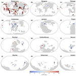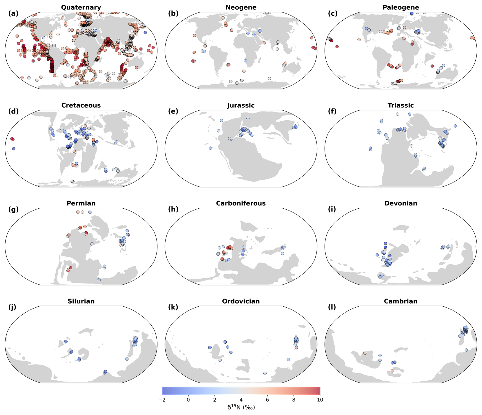 Figure 4Paleogeographic distribution of δ15N values by geological period. The base map is adapted from Kocsis and Scotese (2021).