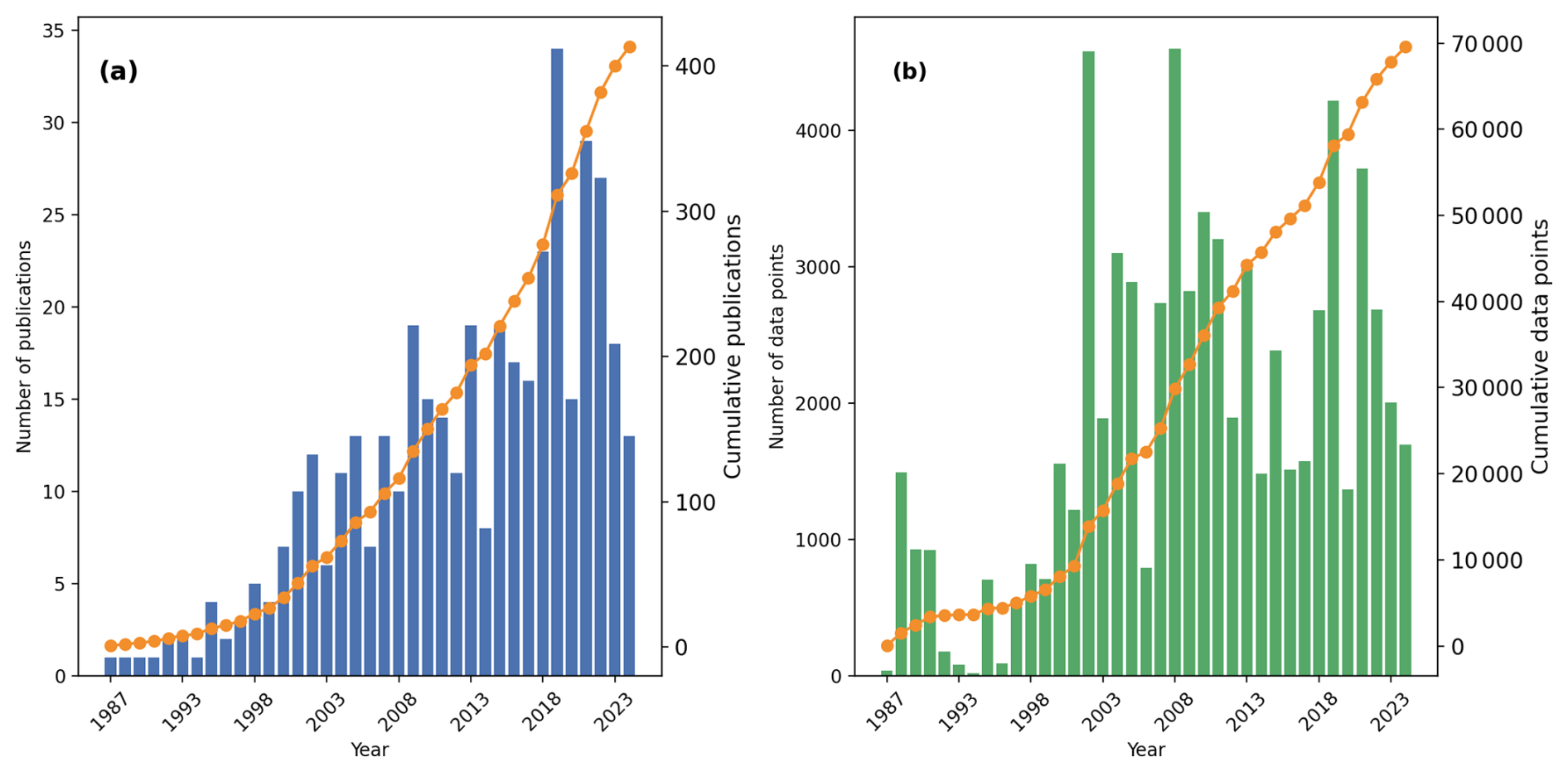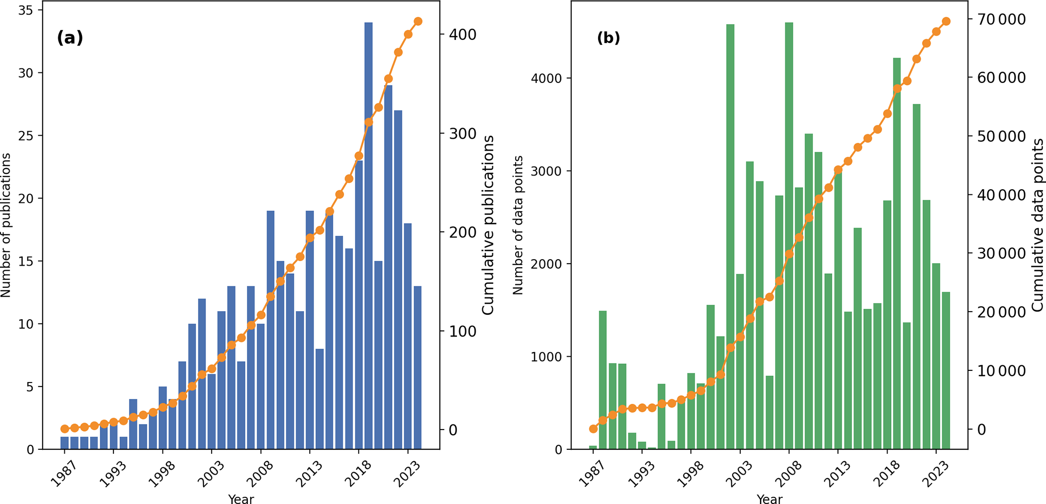 Figure 1Temporal trends in (a) nitrogen isotope publications and (b) δ15N data entries in the DSMS-NI database. Vertical bars denote annual publication/dataset counts, while dots connected by lines represent cumulative totals over the years.