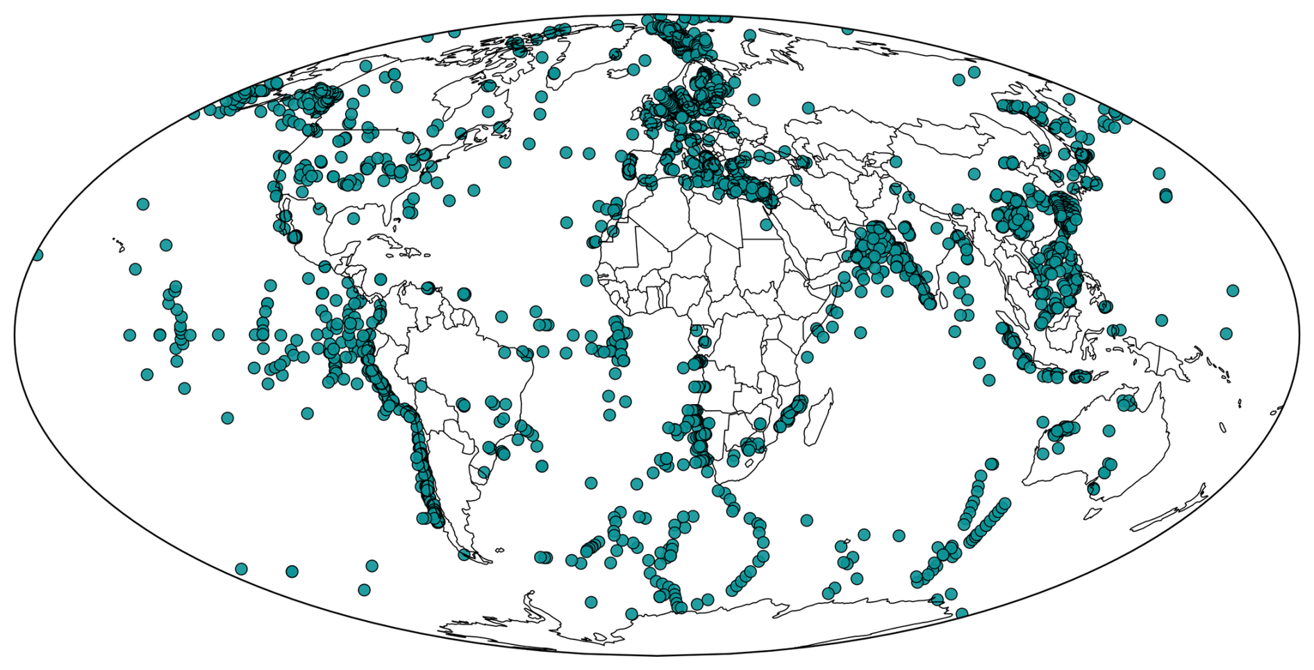 Latitude and longitude values were checked to confirm they fall within the valid ranges of 90 to 90 and 180 to 180, respectively. Sample coordinates were cross-referenced with country names and public national boundaries to ensure geographic accuracy. Modern sample coordinates were projected onto a global map with administrative boundaries (Figs. 2–3) to verify logical placements. If coordinates appeared on land or in other unexpected locations, each entry was manually reviewed and corrected as needed.