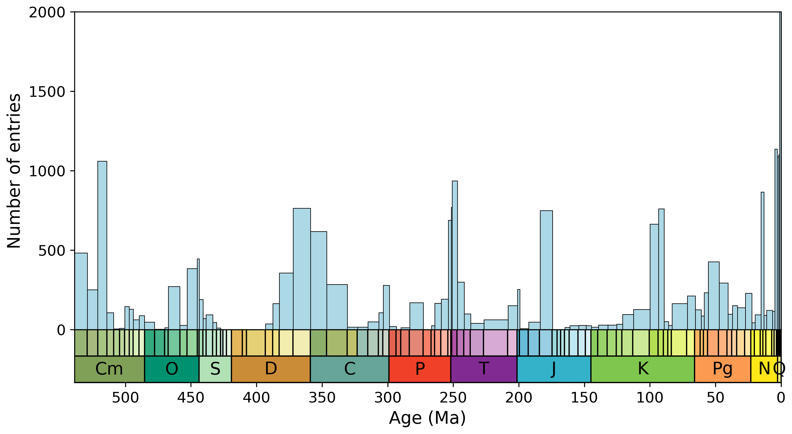 Given that the data are concentrated in the Phanerozoic, for which ages are more precisely constrained, we performed a detailed stratigraphic breakdown of age distribution by stage within the Phanerozoic (Fig. 5). The distribution is uneven, with the highest data densities in recent periods, particularly the Holocene (0–12 ka), Late Pleistocene (12–129 ka), and Chibanian (129–770 ka). The high data density in the Quaternary primarily reflects the abundance of high-resolution records from various ocean drilling projects, whose individual cores contributed large and densely sampled datasets. In contrast, older geological periods exhibit data clusters around key events, such as biotic radiations, mass extinctions, and oceanic anoxic events (Bush and Payne, 2021). Notable gaps or low-density intervals occur in the mid-Cambrian to Early Ordovician, Silurian to Early Devonian, mid-Carboniferous to Early Permian, mid-Triassic to Early Jurassic, and Late Jurassic to Early Cretaceous.