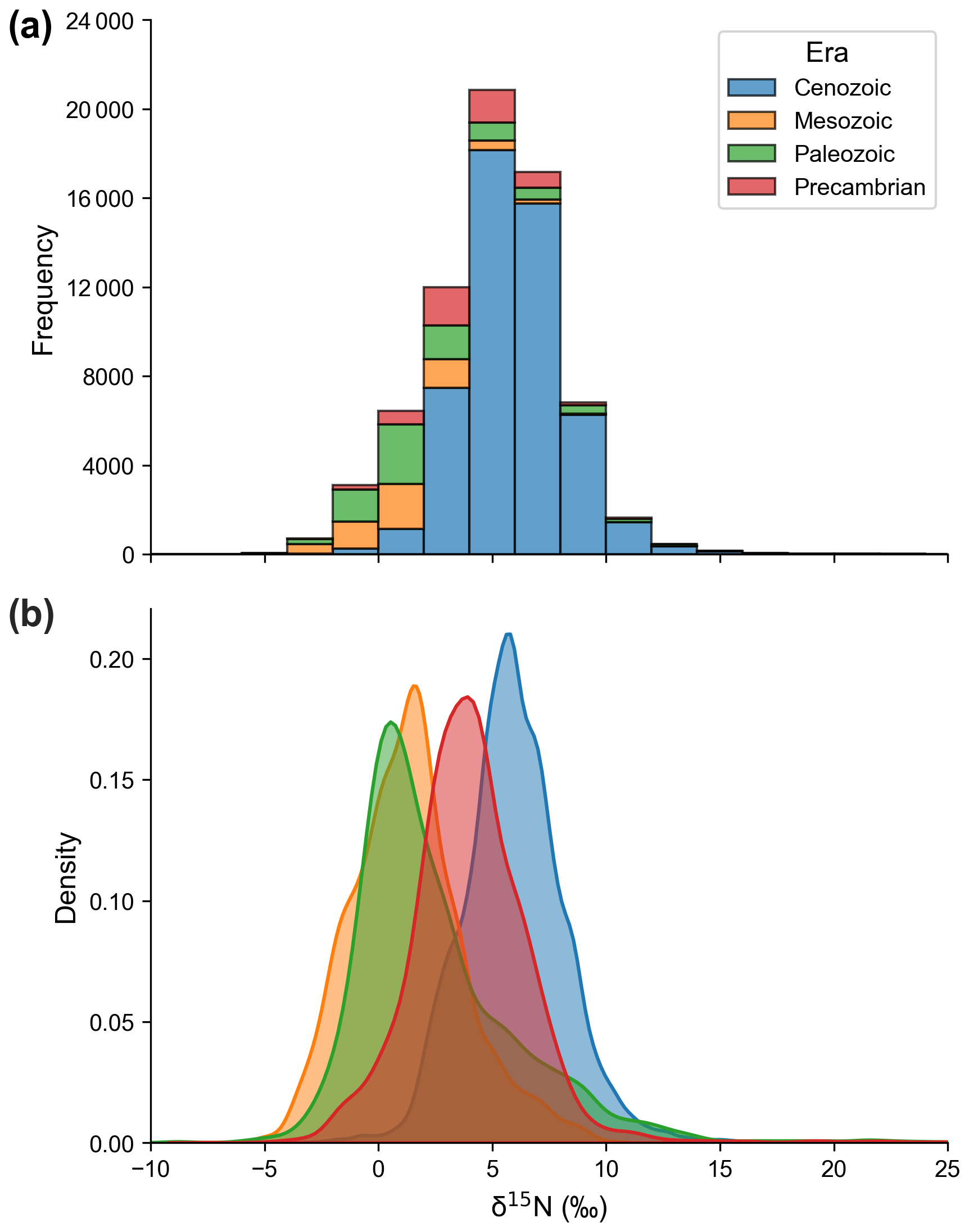 Overall, δ15N values exhibit a unimodal distribution centered around +5 ‰, with a mean of 5.1 ± 9.1 ‰ (1σ; Fig. 6a). When examining the modal values of the era-specific kernel density distributions, the Cenozoic exhibits the highest mode, followed by the Precambrian, with significantly lower modal densities in the Paleozoic and Mesozoic (Fig. 6b). The Precambrian data, which have a dispersed distribution (Fig. 7), indicate an unstable nitrogen cycle, a state potentially driven by the evolution of microbial metabolisms and later overprinted by metamorphism (see Ader et al., 2016; Stüeken et al., 2024 for further discussion). LOWESS smoothing results reveal δ15N peaks in the Neoarchean, Paleoproterozoic, and Ediacaran, i.e., periods closely associated with significant oxygenation events (Kipp et al., 2018; Koehler et al., 2019; Pellerin et al., 2024).