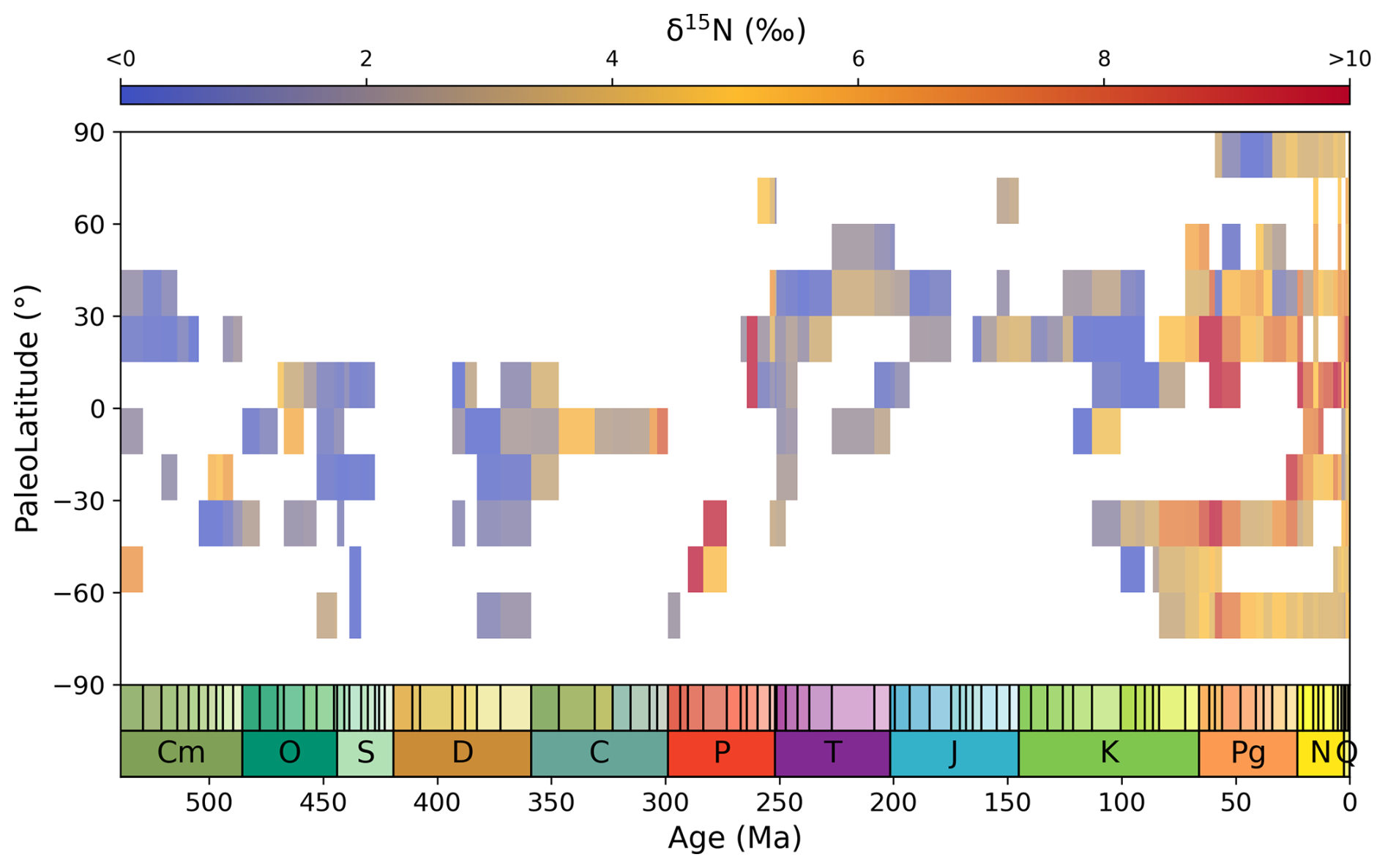 Figure 9Spatio-temporal trends in δ15N values through the Phanerozoic, binned and averaged temporally by stage and spatially by 15° paleolatitudinal bins.