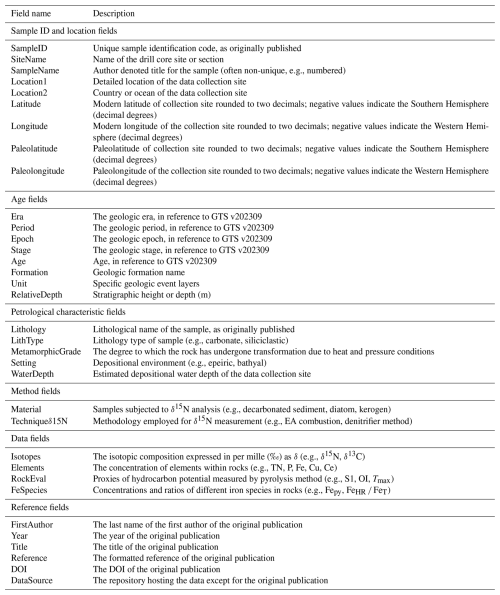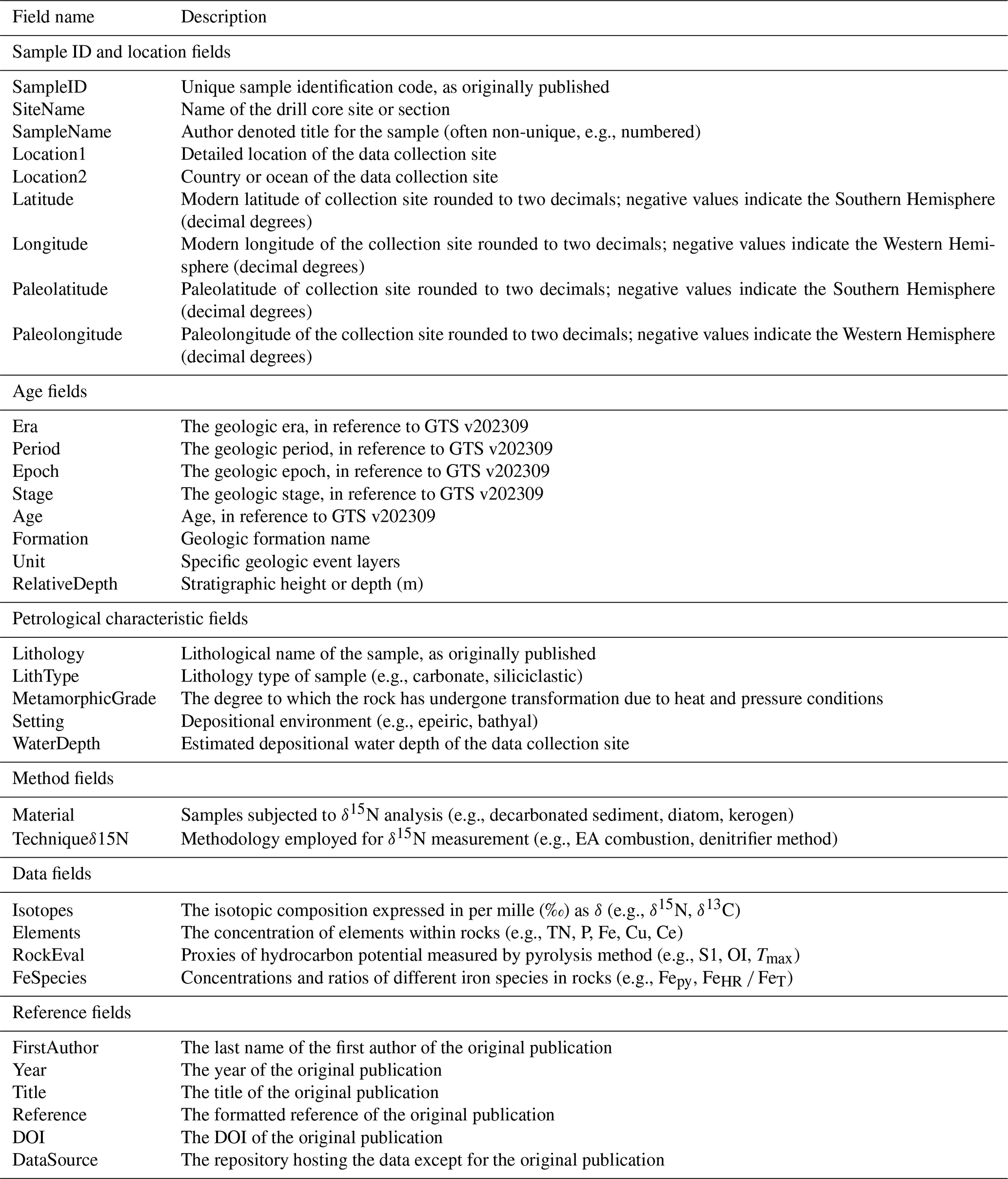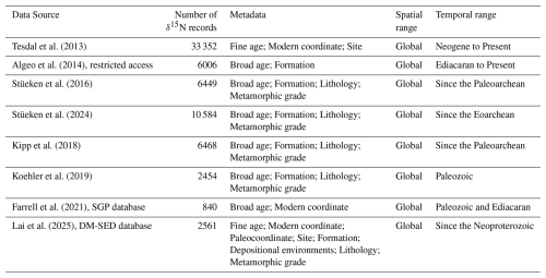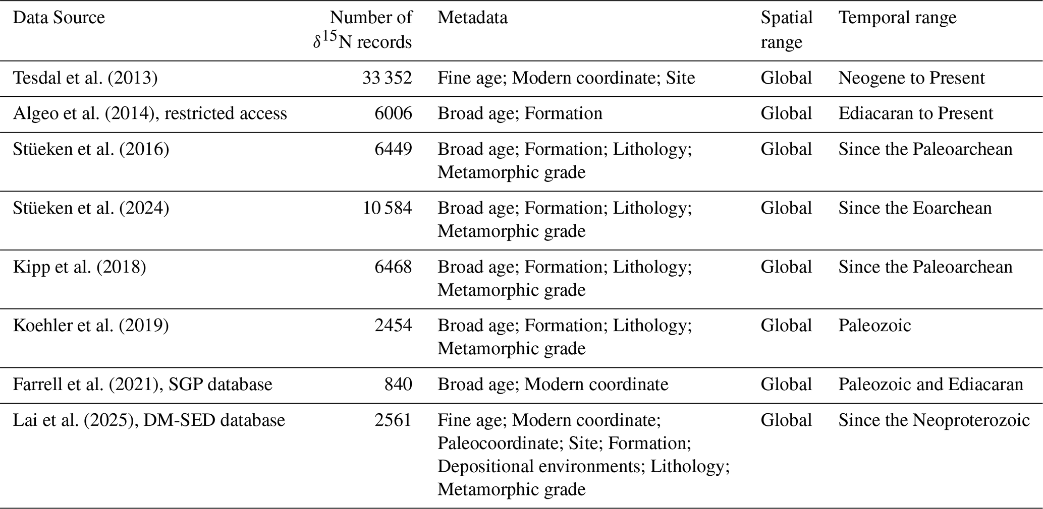 Existing compilations of deep-time marine δ15N records exhibit significant limitations in term of temporal coverage and metadata compliance. Previous efforts have focused specifically on Precambrian to investigate the origins of microbial nitrogen metabolism and redox evolution during the Great Oxygenation Event (Thomazo et al., 2011; Stüeken et al., 2016, 2024; Kipp et al., 2018; Uveges et al., 2025). Other studies have targeted Phanerozoic systems (Algeo et al., 2014) or specific intervals such as the Paleozoic (Koehler et al., 2019), Cambrian (Wang et al., 2018; Liu et al., 2020), Carboniferous (Algeo et al., 2008), Triassic (Sun, 2024), and Cenozoic (Tesdal et al., 2013) to analyze key biological and environmental events. The largest compilation of data from pre-Cenozoic records contains fewer than 8000 δ15N entries (Stüeken et al., 2024). In contrast, Tesdal et al. (2013) compiled up to 33 352 entries, but all of these records are from the past 6 million years. Moreover, these repositories often fail to adhere systematically to the FAIR (Findable, Accessible, Interoperable, Reusable) data principles (Wilkinson et al., 2016) and offer limited metadata categories. Typically, they provide only broad geologic ages, lithology, and metamorphic grades, while lacking essential metadata such as paleogeographic coordinates, depositional environments, and high-resolution chronostratigraphy (Table 1). Current metadata-rich databases that follow FAIR principles remain limited to fewer than 3000 δ15N entries (e.g., Farrell et al., 2021; Lai et al., 2025), highlighting the urgent need for a rigorously standardized, spatiotemporally comprehensive δ15N database.