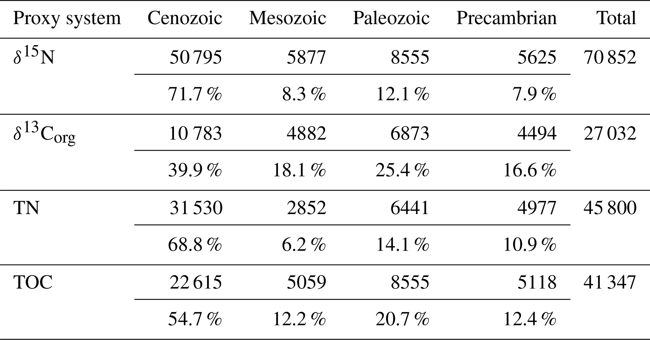 The latest version of the DSMS-NI database comprises approximately 320 000 data entries, including 70 854 δ15N records, spanning all geological periods from the Eoarchean ( 3800 Ma) onward. These records originate from a diverse array of unique sampling sites, encompassing ocean drilling cores and outcrop sections. The δ15N data are predominantly concentrated in the Phanerozoic, comprising 92.1 % of the total database, with further breakdowns showing 71.7 % in the Cenozoic, 8.3 % in the Mesozoic, and 12.1 % in the Paleozoic (Table 3 and Fig. 3). The following sections focus on first-order spatial and temporal trends in δ15N data density, sampling locations, and values within DSMS-NI. The provided figures illustrate only a subset of the spatial-temporal patterns uniquely revealed by this extensive compilation, demonstrating the database's potential to advance research in paleoclimate, geochemistry, and paleoecology.