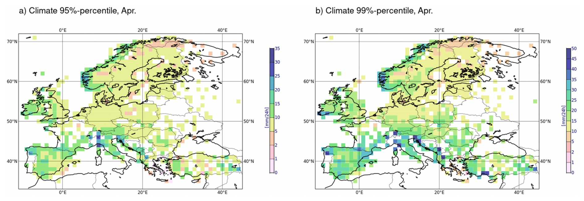 Figure 4 show aggregated climatological percentiles over grid boxes of size 1°×1°. Figure 4a and b shows the 95 % and 99 % percentiles of the local daily precipitation climatology, respectively. In other words, there is, on average, a 5 % and a 1 % chance to exceed the thresholds indicated in Fig. 4a and b, respectively. We see that the term “rare events” can refer to very different absolute thresholds (in mm per 24 h) wether one is focusing on the South-Western coast of Norway or on the Eastern coast of Spain.