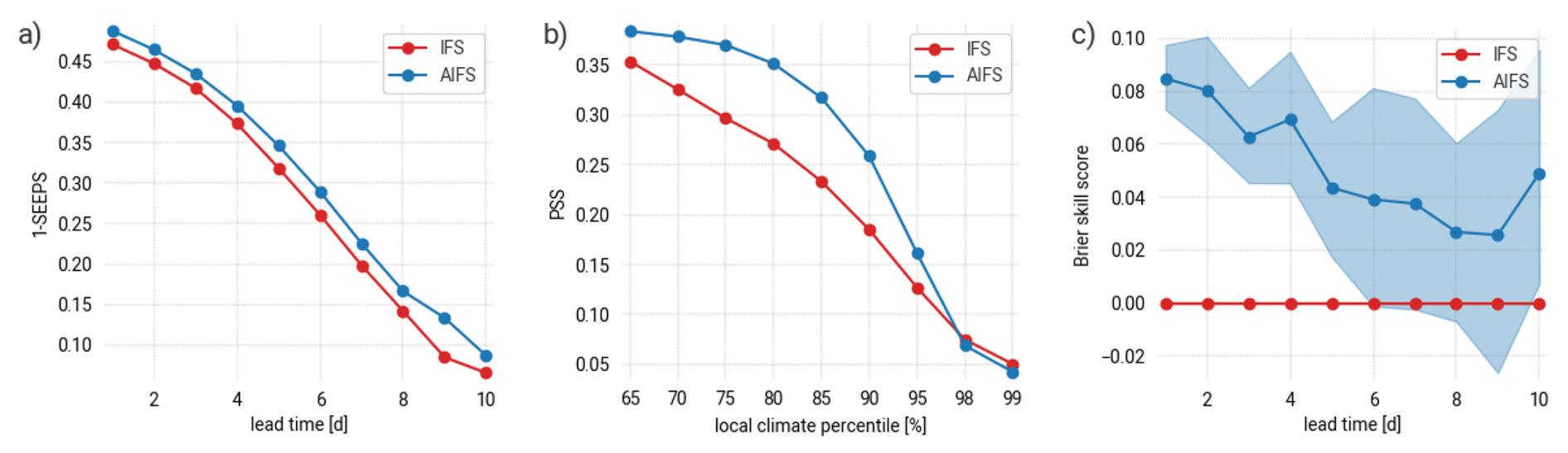 Figure 5Example of verification results for a deterministic and a probabilistic forecast: (a) SEEPS (shown as 1-SEEPS, the higher the better) as a function of the forecast lead time, (b) a contingency table based score (here PSS, the higher the better) as a function of the local climate percentile, (c) the Brier skill score as a function of the forecast lead time using IFS as reference for a rare event defined as daily precipitation exceeding the 95th percentile of the local climatology. The shading indicates the 5 %–95 % confidence interval as estimated with block-bootstrapping.