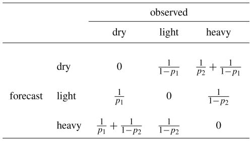 Table 1SEEPS scoring matrix: We reproduce the SEEPS scoring matrix here, which describes the penalty applied when the observation and forecast categories do not match as in Eq. (15), Rodwell et al. (2010).