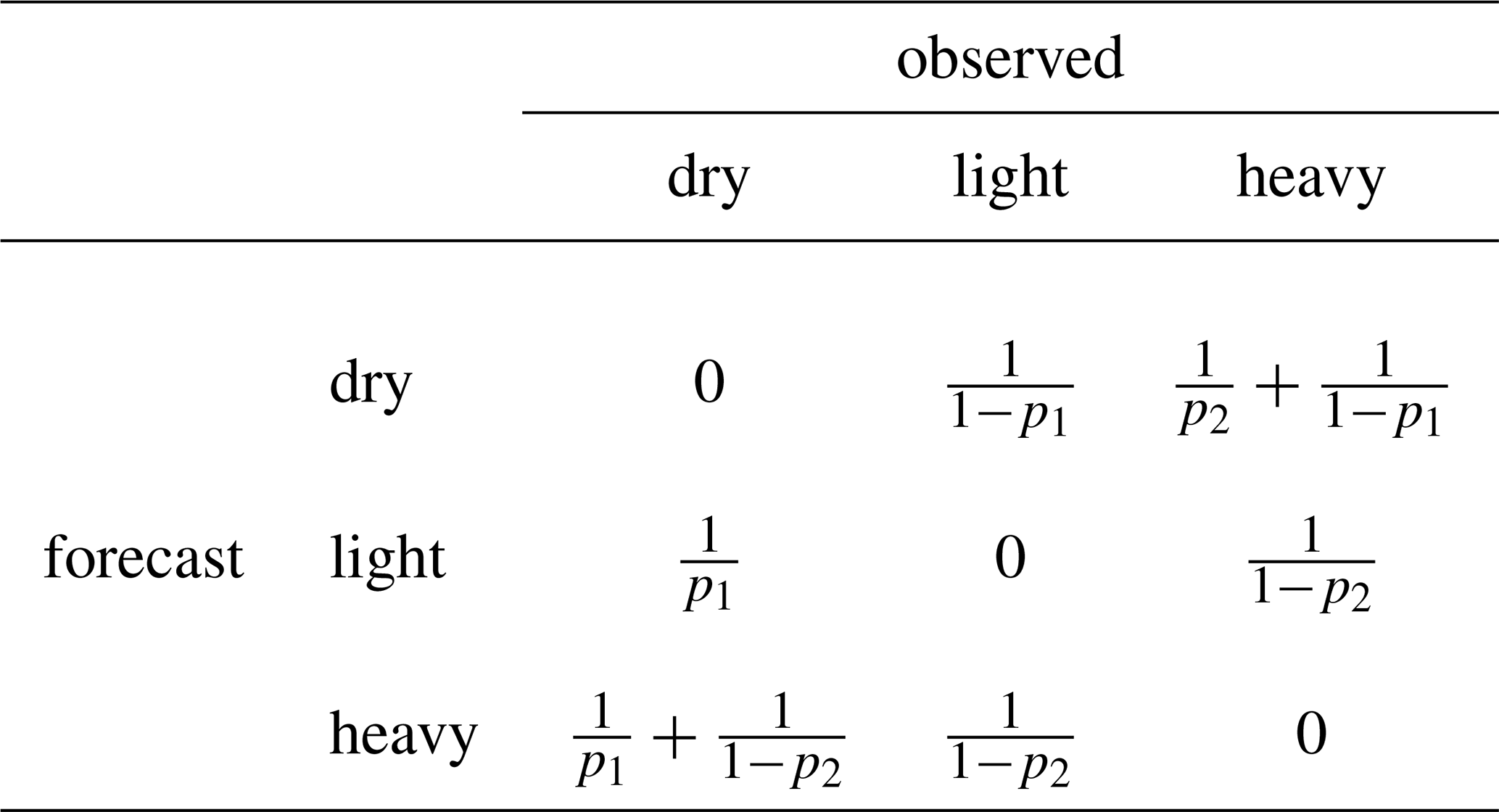 The stable and equitable error in probability space (SEEPS) is introduced and defined in Rodwell et al. (2010). Practically, to compute the score, observations and forecasts are binned into one of the 3 following precipitation categories: dry, light, and heavy. Thresholds denoted t1 and t2 are used to define the switch from dry to light, and from light to heavy, respectively. The climatological probabilities of the observation exceeding t1 and t2 are denoted p1 and p2, respectively. A penalty is applied whenever a forecast and the corresponding observation do not fall in the same category. The penalty applied is a function of the climatology as shown in Table 1.