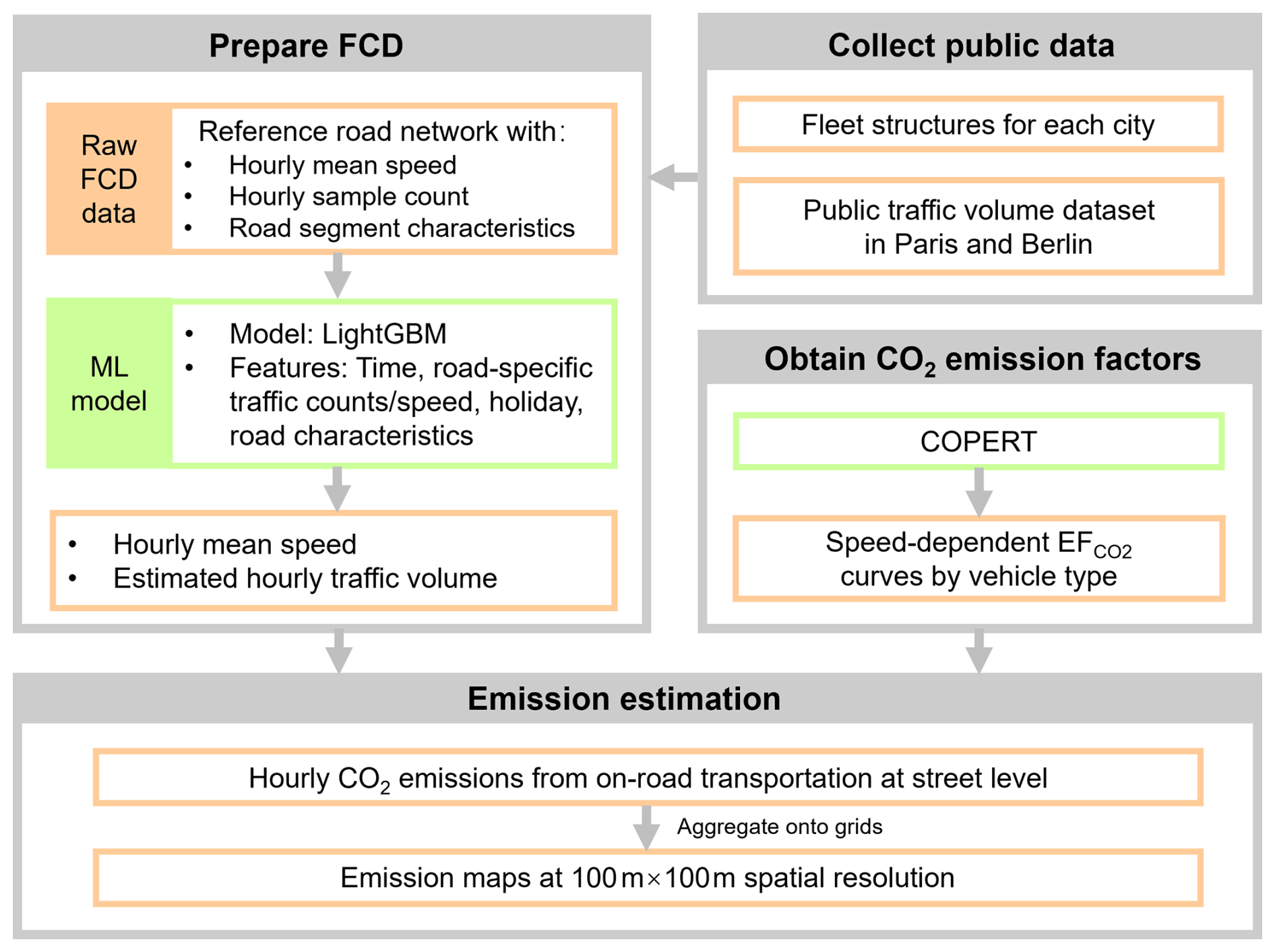 Figure 1 describes the workflow of this study. The GPS-based high-resolution “Floating Car Data” (FCD) on individual vehicle flow (GPS vehicles counts per street each hour) and speed covering every street was obtained from a data aggregation provider that collects GPS position data from cars (passenger cars) and trucks (light commercial vehicles and heavy duty trucks), providing road-specific information on hourly average speed and sample counts (i.e., the number of cars recorded in each street for each hour). Those GPS data are linked with precise cities' road network datasets, providing detailed information on road length, road functional class, and truck access authorization. All data is anonymized by the data provider to prevent compromising any individual or organizational data privacy issues. After raw data processing and cleaning, a machine learning model was used to fill in missing values in FCD, as well as to transform FCD sample counts limited to vehicles equipped with GPS into traffic volumes for all vehicles. Then, the COPERT model (Ntziachristos et al., 2009), the EU standard vehicle emissions calculator, was applied for estimating specific CO2 emission factors based on individual vehicle hourly average speed and type. Combined with the road lengths obtained from geographical databases and with fleet structures, we finally estimate street-level road-specific emissions using the following equation:
