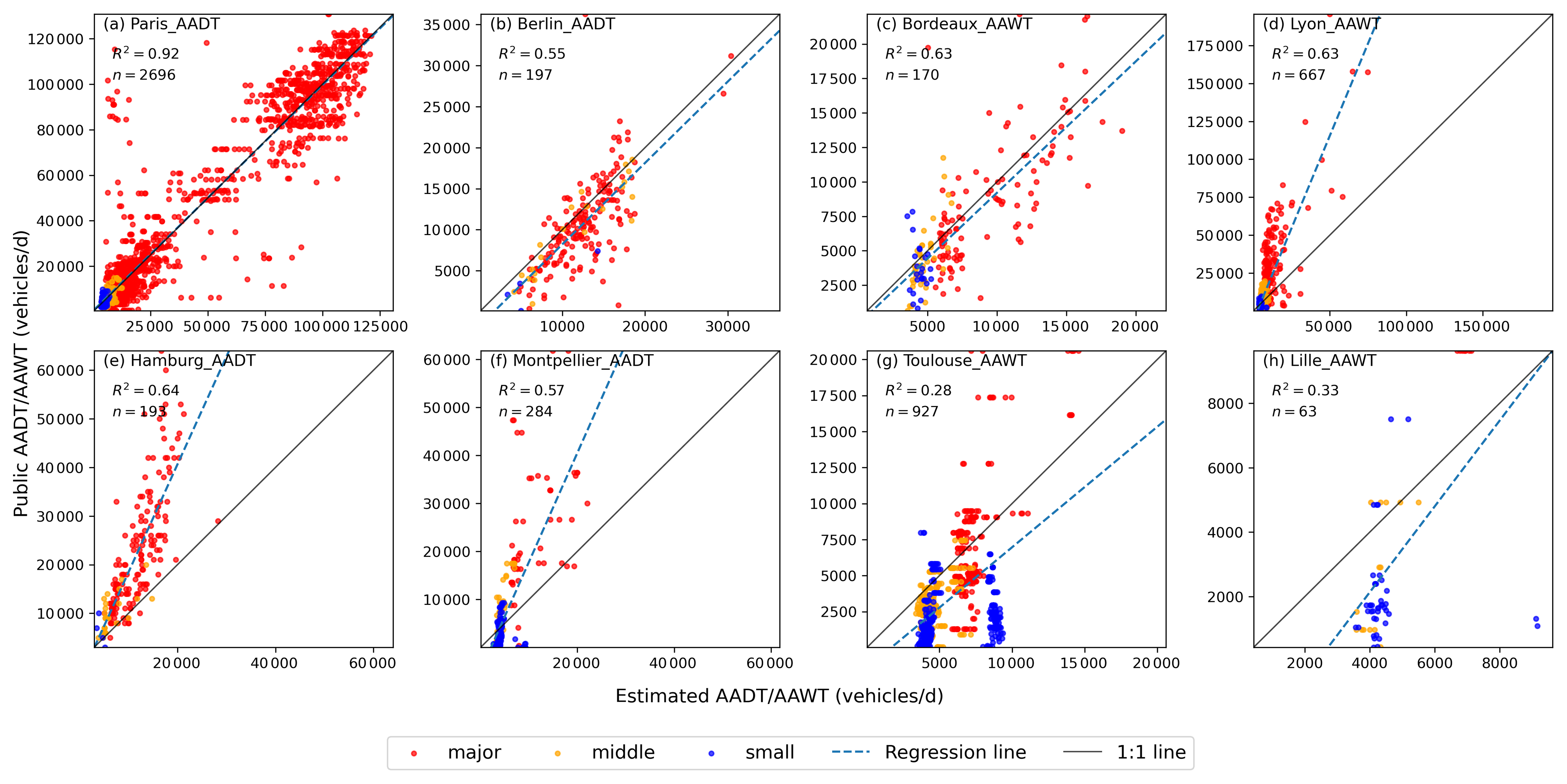 In addition to Paris and Berlin that are used for model training, observed traffic-count-based annual average daily traffic flow (AADT, in number of vehicles per day) or annual average weekday traffic (AAWT, equivalent to AADT excluding weekends) datasets are available for six additional cities reported in a recent study (Bonnemaizon et al., 2025): Montpellier and Hamburg (AADT), and Bordeaux, Lyon, Toulouse and Lille (AAWT). The comparison which serves as independent external validation to assess our traffic volume estimates is shown in Fig. 3. Paris, the most important reference city for model development, shows strong agreement between estimated and public AADT values (R2= 0.92, n= 2696), with data points across all road classes closely aligned with the 1:1 line. Berlin exhibits noticeably larger dispersion, with a moderate R2 (0.55) derived from a relatively small sample size (n= 197), which likely contributes to the lower correlation.
