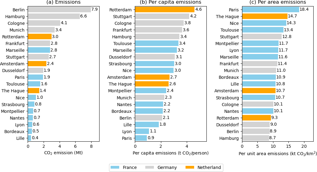 Figure 4Annual CO2 emission and emission intensities per capita and per unit area of 20 cities in 2023. Grey, light blue and orange represent cities in Germany, France and the Netherlands, respectively.