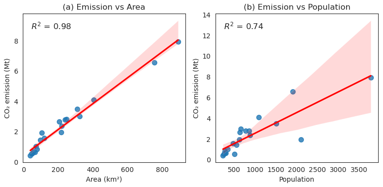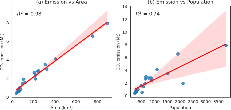 Figure 5Linear relationships between on-road CO2 emissions, area, and population. Each point represents one city.