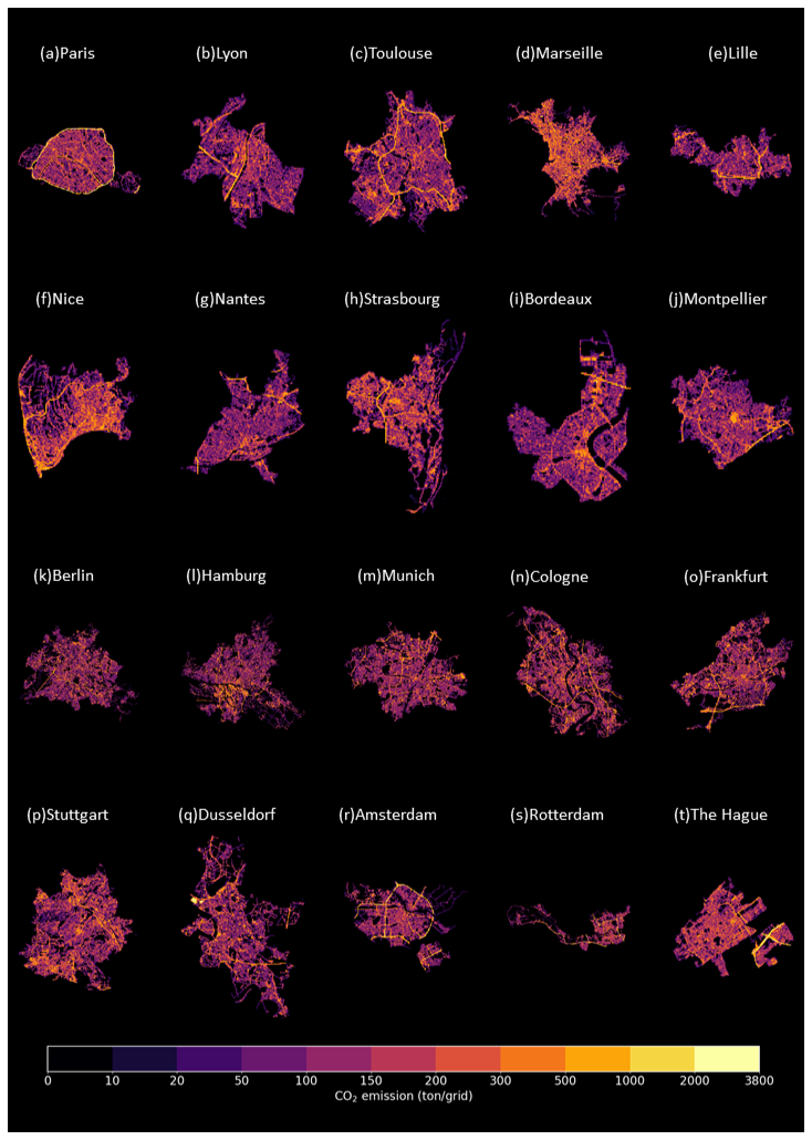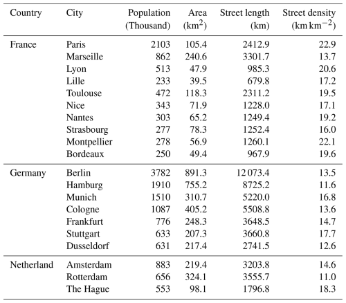Our FCD source covers France, Germany, and the Netherlands. Therefore, the 20 most populous cities within these three countries were selected to develop high-resolution emission maps. Table 1 shows the basic information (population, area, street length, street density) of the 20 cities in 2023. Note that here Paris is the administrative city jurisdiction (Ville de Paris) covering the central 20 arrondissements, so its area is much smaller than Berlin, which is both a city and a federal state.