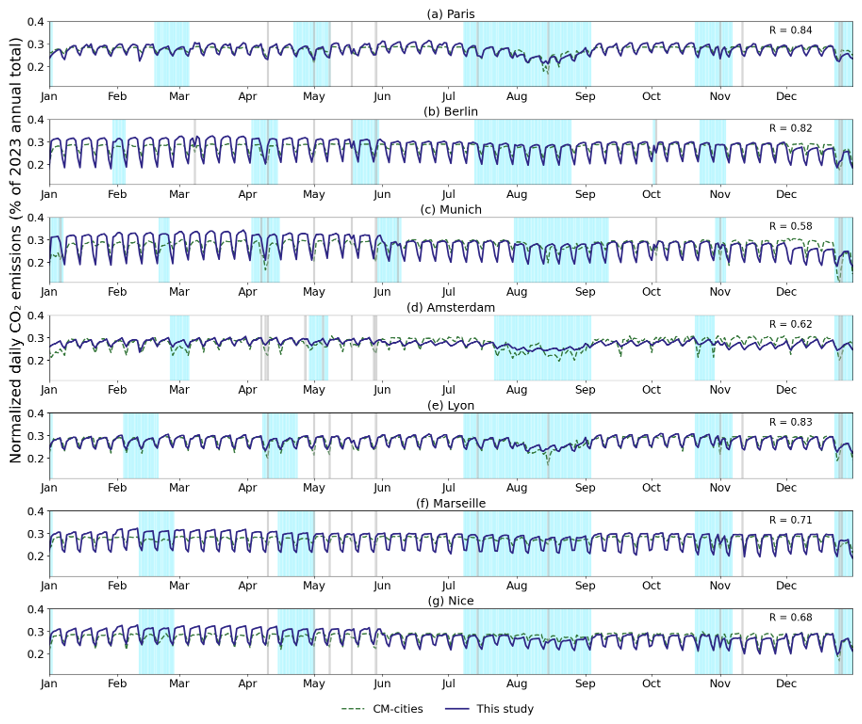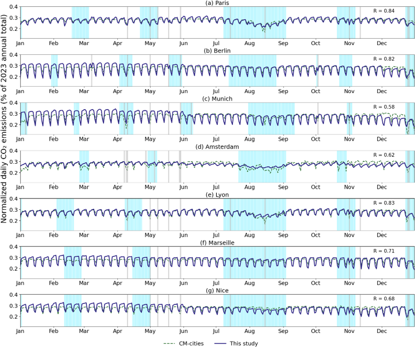 Figure 7Normalized daily CO2 emission of seven cities in 2023. Y axis represents each day's CO2 emissions divided by the city's total emissions in 2023. The light blue and grey shades represent school holidays and public holidays, respectively. The y axis represents each day's CO2 emissions divided by the city's total emissions in 2023.