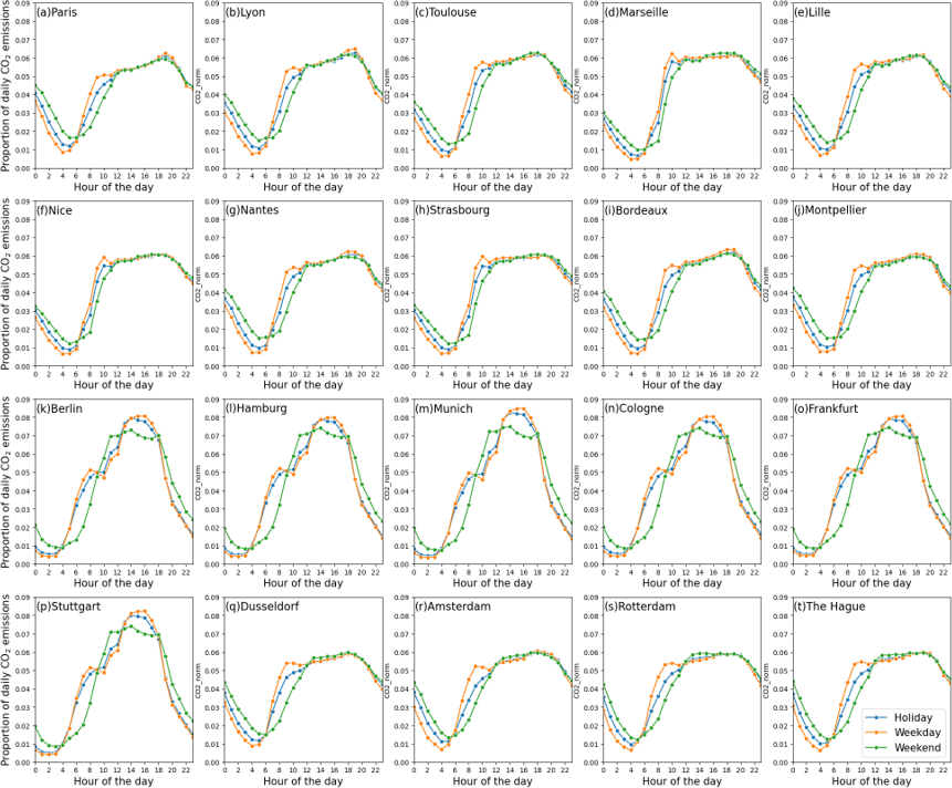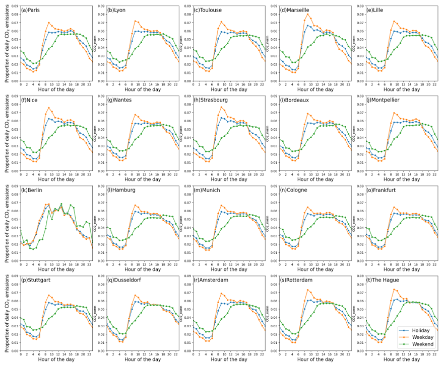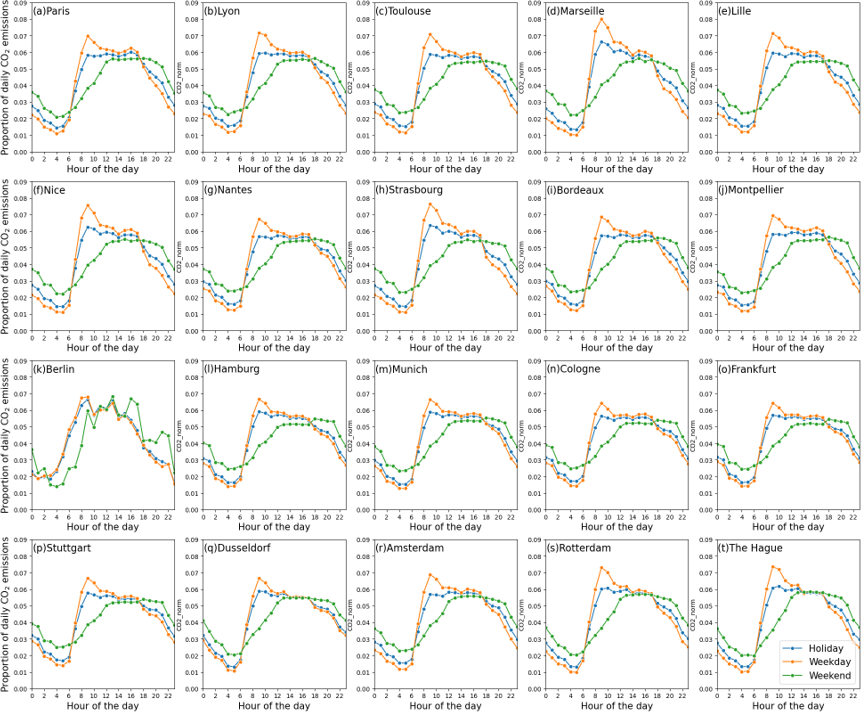 Figure 8 presents the average hourly CO2 emission patterns for cars across the 20 cities in 2023. The y axis represents the average proportion of daily CO2 emissions for each hour, categorized by day types: holidays (blue), weekdays (orange), and weekends (green). The hourly patterns for cars in French cities and Dutch cities are similar. On weekdays, there are two emission peaks at 09:00–10:00 and 18:00–19:00 LT due to commuting, and the emissions stabilize at relatively high levels between these two peaks. After the second emission peak, the emissions decline continuously and reach their lowest point at 04:00–05:00. The differences between weekdays and holidays are relatively small, but with no or a less pronounced morning peak due to reduced commuting activity. On weekends, the sum of average emission share in French cities and Dutch cities during evening and early morning (22:00 to 06:00) reach 22.9 % to 29.1 %, significantly higher than that for weekdays (17.4 % to 21.7 %), and the first peak is lagged to around 12:00. German cities on weekdays, except for Dusseldorf, the CO2 emission exhibit earlier morning peaks at 08:00 and a much higher peak around 15:00–16:00. On average, evening peak emissions in French and Dutch cities are only around 15 % higher than morning peak levels, but for German cities specifically, the difference ranges from 9.3 % to 60.0 %. After the peak, the CO2 emissions in German cities decrease sharply, which is consistent with the trends reported by the Berlin datasets (Anjos et al., 2025). On weekends, there is only one peak around 13:00.