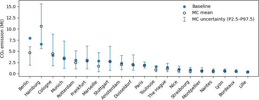Figure 10 shows the uncertainties in annual emissions arising from uncertainty in traffic volume estimates. Overall, the Monte Carlo–derived mean emission estimates are close to the original deterministic estimates for most cities, with the Monte Carlo means being on average 13.1 % lower across the 20 cities. the differences between the Monte Carlo mean and the deterministic estimate for Paris (7.0 %), Lyon (+7.3 %), and Bordeaux (13.4 %) remain within ±15 %, indicating relatively stable estimates despite uncertainty propagation. Noticeable differences are observed for Berlin (41.4 %), Hamburg (+61.4 %), Marseille (41.2 %), and Toulouse (46.5 %), where the differences between the Monte Carlo mean and the deterministic estimate exceed 40 %.