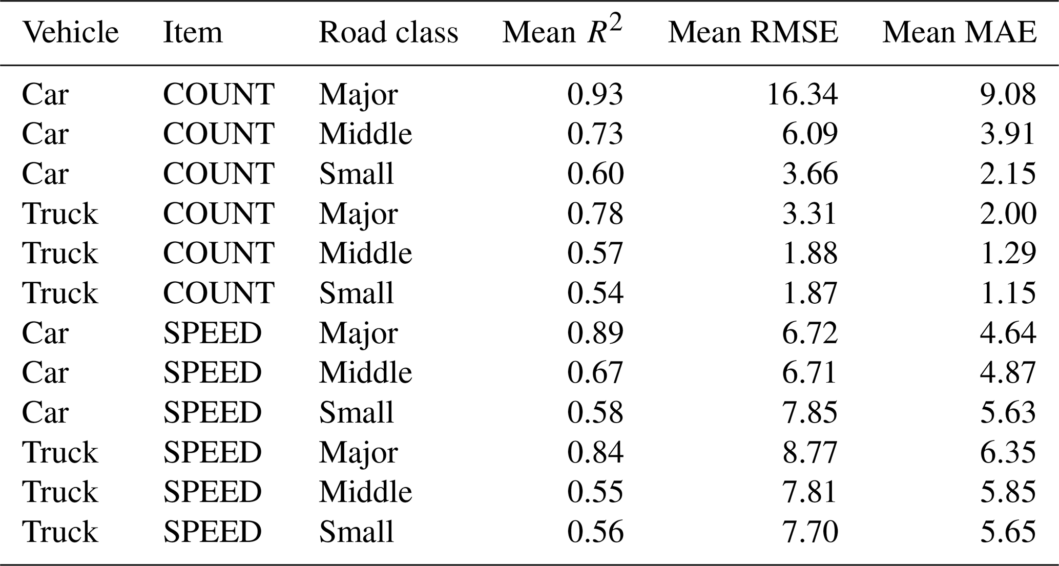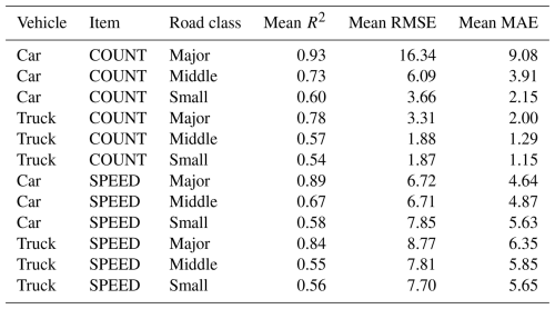 Missing values exist in the FCD due to unstable GPS signals, especially for small roads. The average data coverage of GPS cars on major, middle, and small roads ranges from 67.0 %–97.7 %, 40.4 %–93.8 %, and 6.1 %–37.7 %, respectively (Fig. S1a in the Supplement). The average data coverage of trucks is lower, ranging from 32.2 %–75.8 %, 32.1 %–85.3 %, and 1.8 %–32.2 %, respectively (Fig. S1b). Machine learning was used here to fill data gaps, as the use of machine learning techniques has shown great potential for both temporal and spatial imputation of missing data to reconstruct the full volume of traffic (Wen et al., 2022). Eight features were chosen as predictors (Table 2) to train models. Temporal features (hour, day of the week, and month) were used to capture diurnal and seasonal patterns in traffic behaviour. Observed road-specific daily mean traffic counts and speeds derived from hourly averages were also used as indicators of baseline traffic intensity. Holiday indicators, including school and public holidays, were included to account for potential shifts in travel demand. Finally, road characteristics including speed category, functional class, and lane category were used to describe the physical and functional attributes of each road segment.