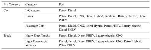 This study collected fleet structures data in 2023 for the 20 cities to further map cars and trucks to 5 categories (passenger cars, light commercial vehicles, buses, L-category and heavy-duty trucks), and 12 sub-categories, 10 fuels (petrol, diesel, CNG, diesel hybrid, biodiesel, diesel PHEV, CNG biofuel, petrol hybrid, battery electric), as shown in Table 4. The data that is reported annually was collected from the official statistical websites of France, Germany, and the Netherlands (Table S7). Only direct emissions from fossil fuels are considered, so the emission factor of battery electric cars is set to 0.
