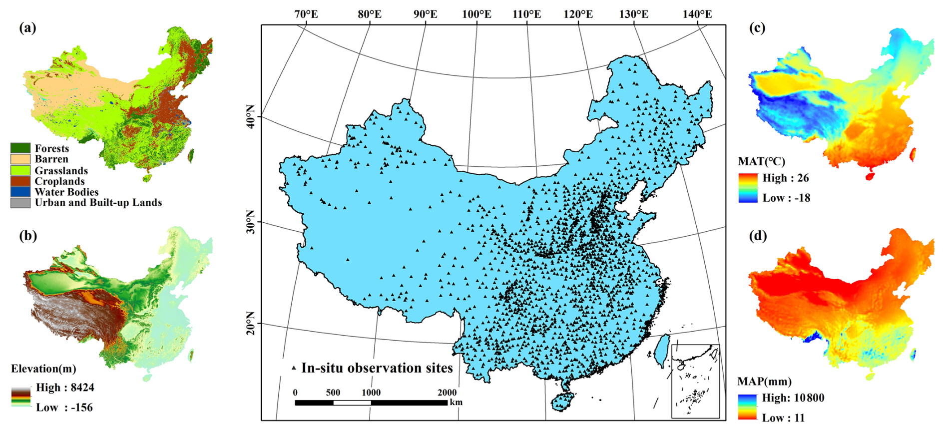 The observation network spans a wide range of climatic zones – from cold and temperate to subtropical and tropical, and includes diverse land-use and ecosystem types, such as forests, grasslands, croplands, and barren lands. However, the spatial distribution of stations is notably uneven. High station density is observed in northeastern China, the central and eastern plains, and the southern hilly regions, whereas station coverage is sparse in the arid and semi-arid regions of northwestern China and on the QTP. The spatial distribution of in-situ observation sites is shown in Fig. 1, and details of the dataset partitioning strategy are provided in Sect. 2.3.3.