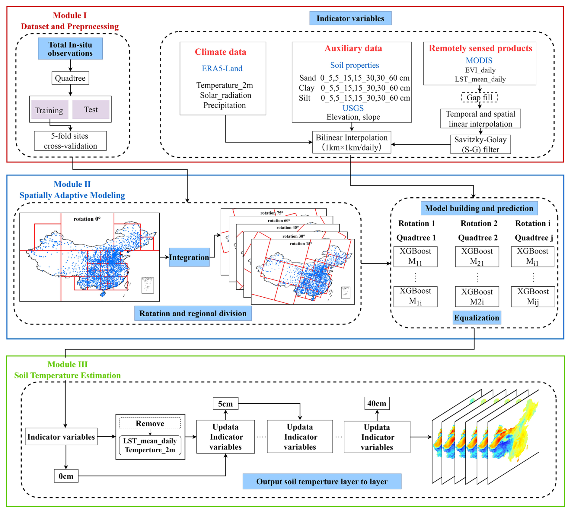 The spatial adaptive modeling framework consists of three modules as shown in Fig. 2. Module I is for data collection and preprocessing, which mainly involves in-situ observations, remote sensing, meteorological and supplementary data. Module II is spatial adaptive modeling, which mainly includes the construction of rotated quadtrees and local modeling based on XGBoost. Finally, module III is the layer-to-layer reconstruction of daily 1 km resolution multi-layer (0, 5, 10, 15, 20, and 40 cm) Ts datasets in China from 2010 to 2020.