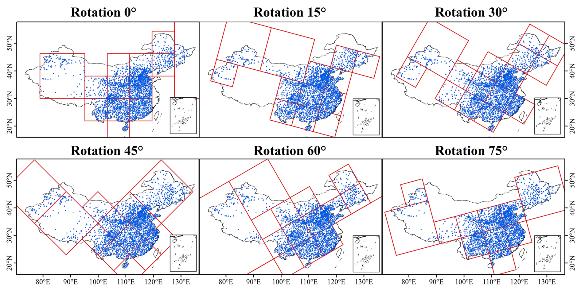 Rotation at different angles. To reduce potential edge effects introduced by static grid boundaries, we implemented a rotated quadtree partitioning strategy. The quadtree structure was rotated at six angles (0, 15, 30, 45, 60, and 75°), producing distinct sets of spatial partitions for each orientation (Fig. 3). Independent models were trained for each rotated configuration, and the final Ts estimates were obtained by averaging the outputs from all six models. This rotation-based ensemble method improves spatial smoothness and minimizes discontinuities at partition boundaries.