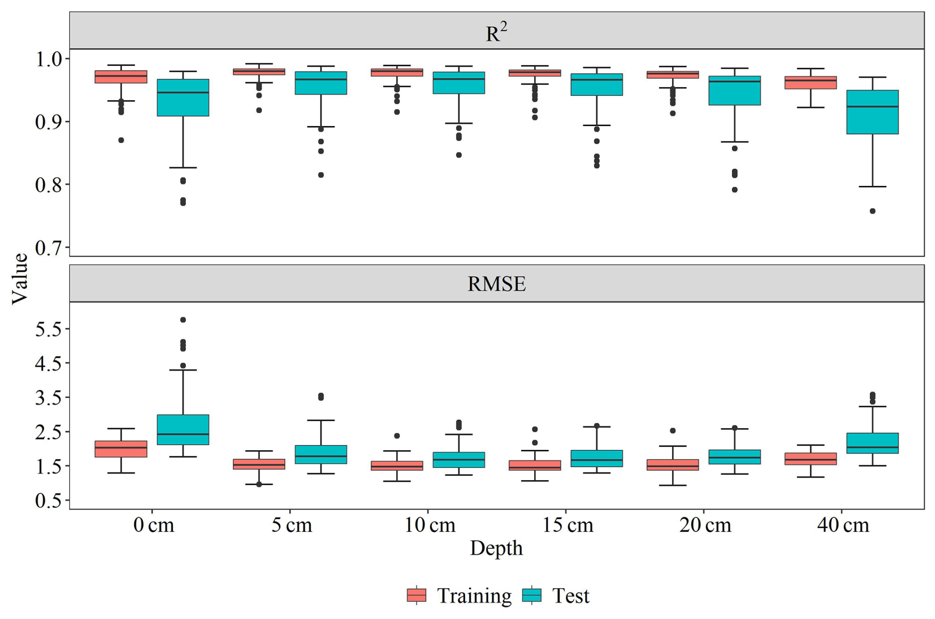 Figure 4 shows the accuracy of the models constructed at different depths using various grid configurations and rotation angles for both the training and test sets. The grouped box plots indicate that the median R2 values range from 0.92 to 0.98 and the median RMSE values range from 1.6 to 2.4 K across depths. Both training and test results exhibit consistently high accuracy, with no clear indication of overfitting. A vertical comparison shows that model performance at 0 and 40 cm is slightly weaker than that at intermediate depths.