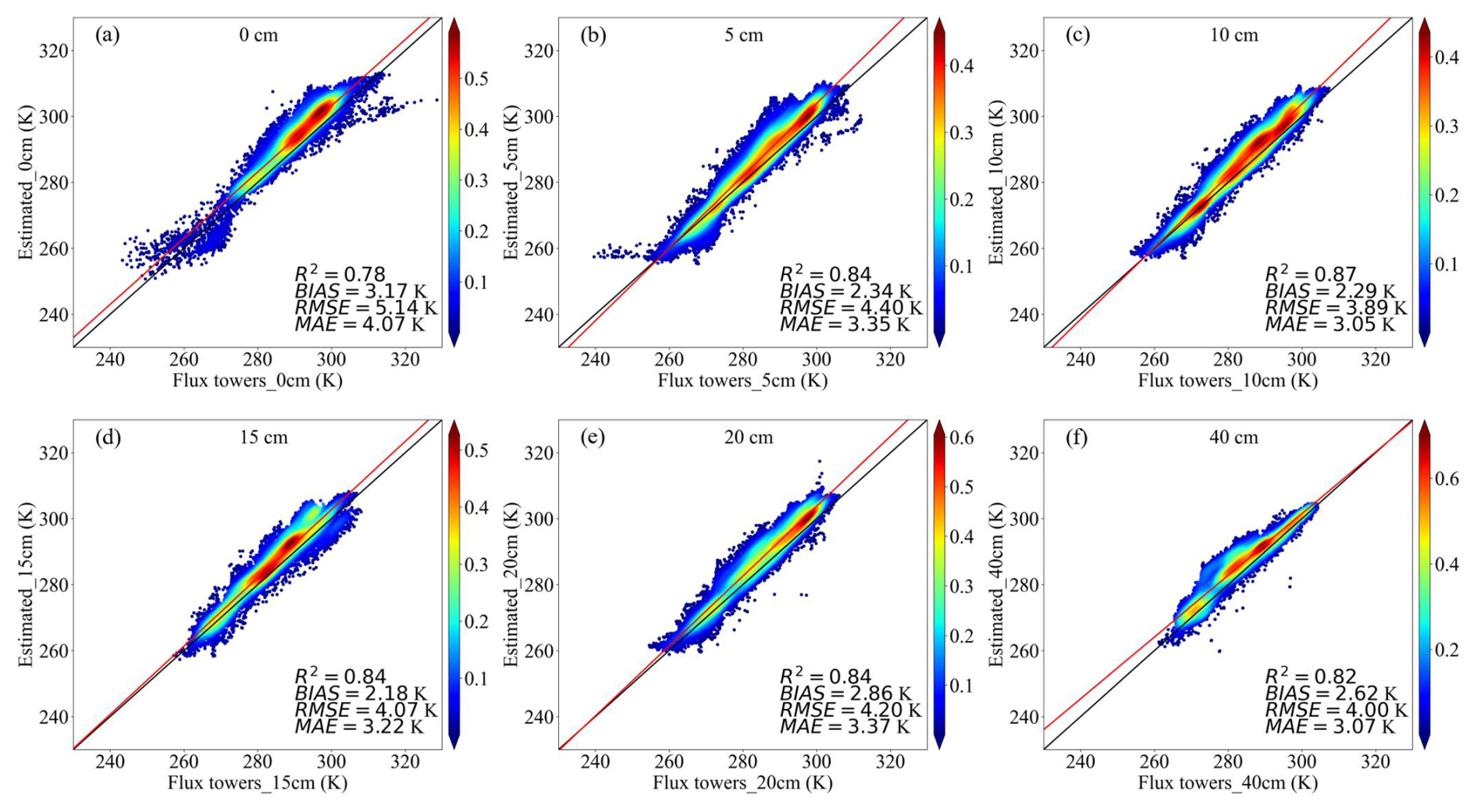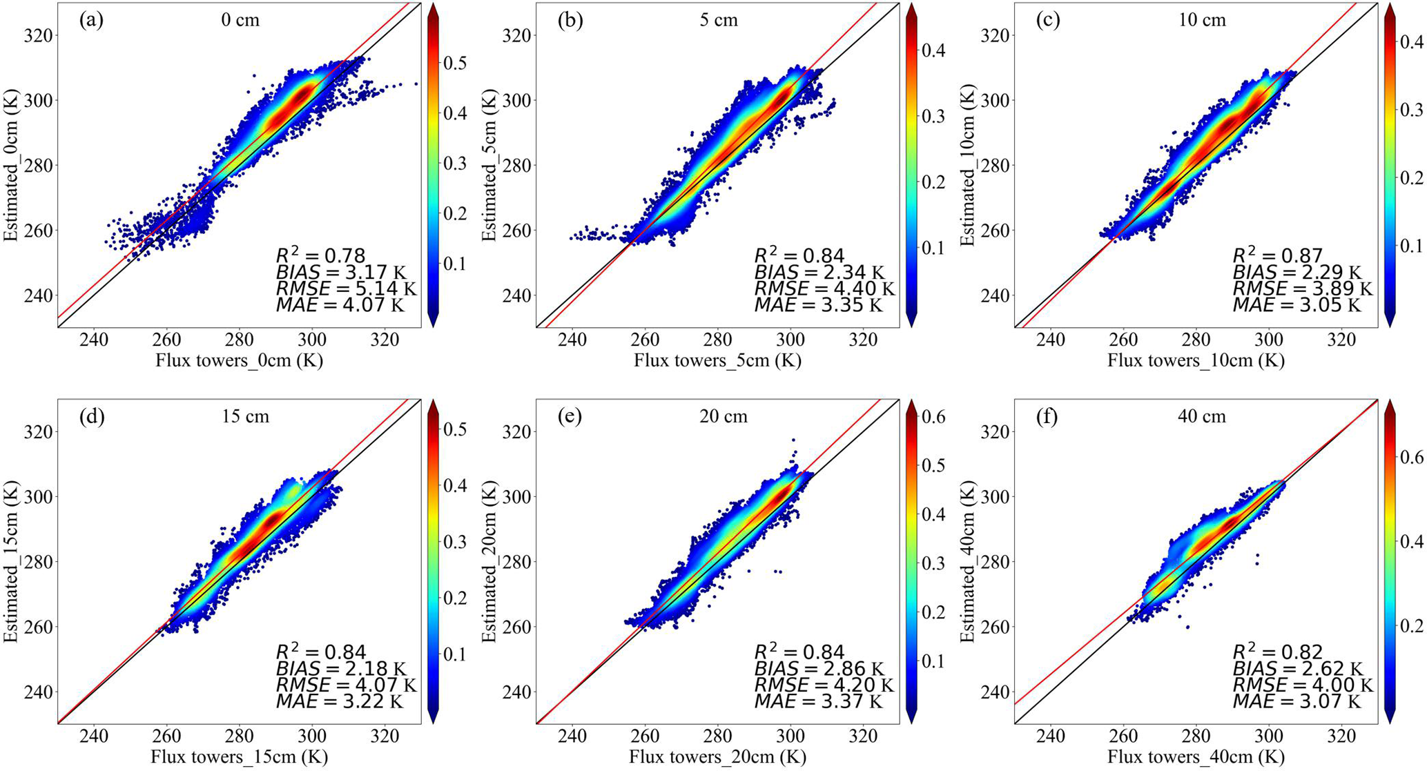 Figure 5Density scatter plots comparing estimated daily Ts with flux tower observations at different depths.