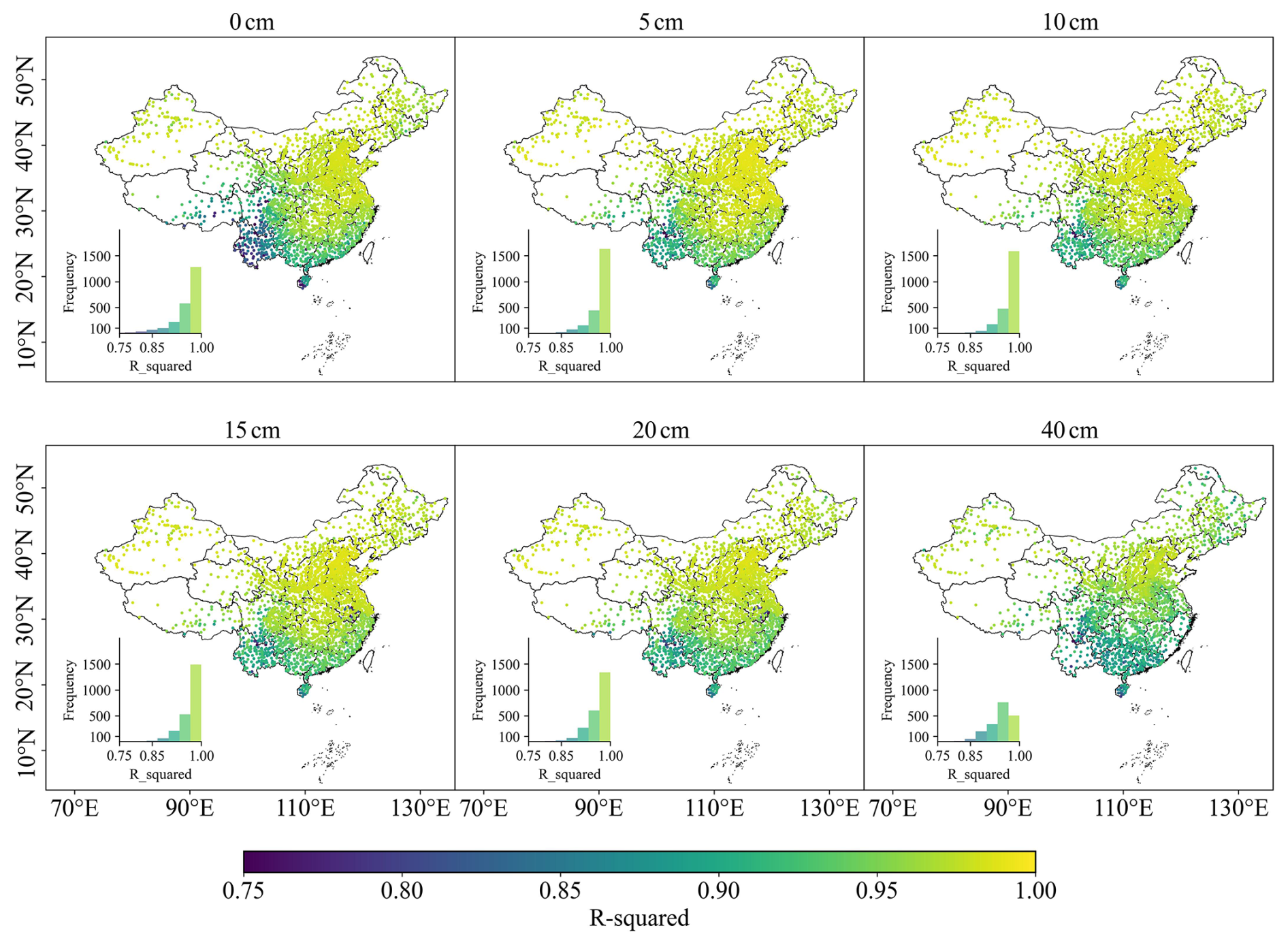 We also calculated R2 and RMSE values for all depths at each station to compare the model performance. The results indicate that R2 ranges from 0.70 to 1.00, suggesting generally good performance at the station level. As shown in Fig. 6, most stations achieve R2 values above 0.85. Regions with higher prediction accuracy are primarily distributed across northwest, northeast, and central China, while larger errors are concentrated in the Yunnan–Guizhou Plateau (YGP) and the sparsely monitored QTP. The histogram in Fig. S10 further shows that RMSE values for all depths fall between 0.5 and 3 K, indicating overall good predictive performance. Notably, prediction errors are highest at 0 cm, decrease substantially at 5–20 cm, and increase slightly again at 40 cm. Figure S11 shows the comparison between the estimated and observed annual mean Ts for the test dataset at six different depths (0–40 cm). The R2 ranges from 0.94 to 0.97. The RMSE values range from 0.74 to 1.4 K, and the bias is minimal. The results suggest that the model is able to effectively capture the spatial patterns of Ts across different depths and locations.
