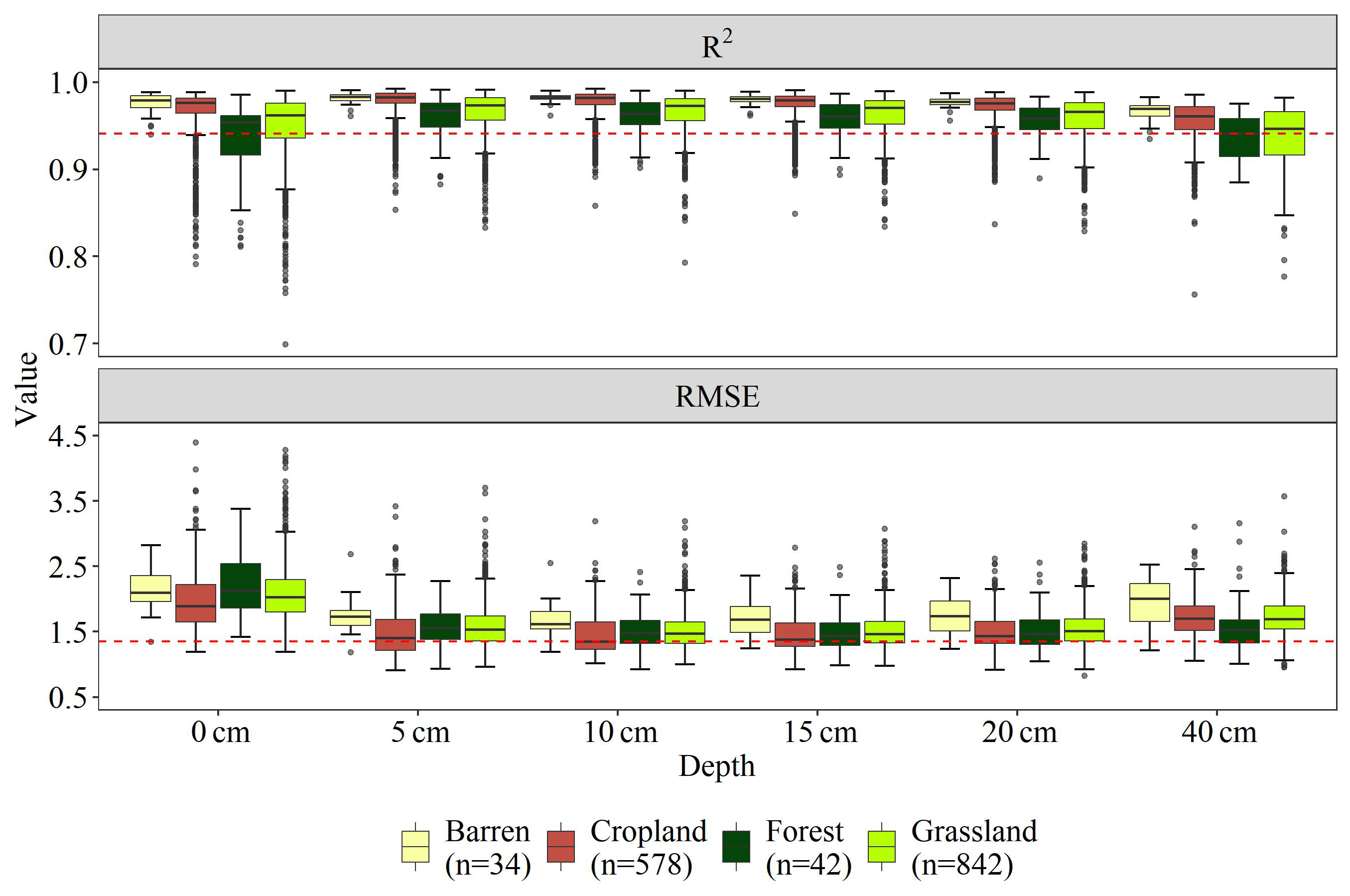 Figure 7Evaluation of predicted Ts at different depths (i.e., 0, 5, 10, 15, 20, 40 cm) across various land use types (i.e., Forest, Grassland, Cropland, Barren).