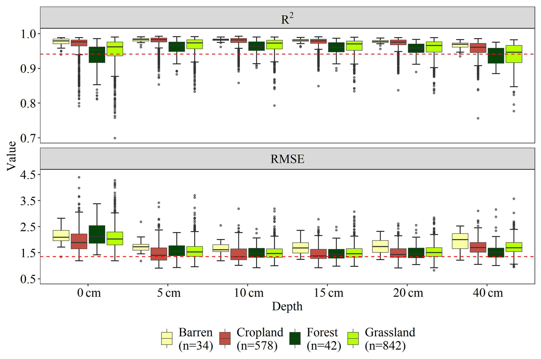 Figure 7 shows grouped box plots of the prediction performance of Ts across different land cover types (barren land, cropland, forest, and grassland) at six depths (0, 5, 10, 15, 20, and 40 cm). The evaluation metrics include R2 and RMSE. The median R2 values across land cover types and depths range from 0.94 to 0.98, consistently exceeding 0.94 (red dashed line), indicating overall high prediction accuracy. Among land cover types, barren land exhibits the highest R2 values, followed by cropland, while forest and grassland show slightly lower performance. The median RMSE values generally range from 1.1 to 1.8 K. Barren land shows higher RMSE compared with other land cover types, whereas cropland, forest, and grassland maintain lower and more stable RMSE. Across depths, RMSE is highest at the surface layer (0 cm), decreases steadily with increasing depth, and shows a slight increase at 40 cm.