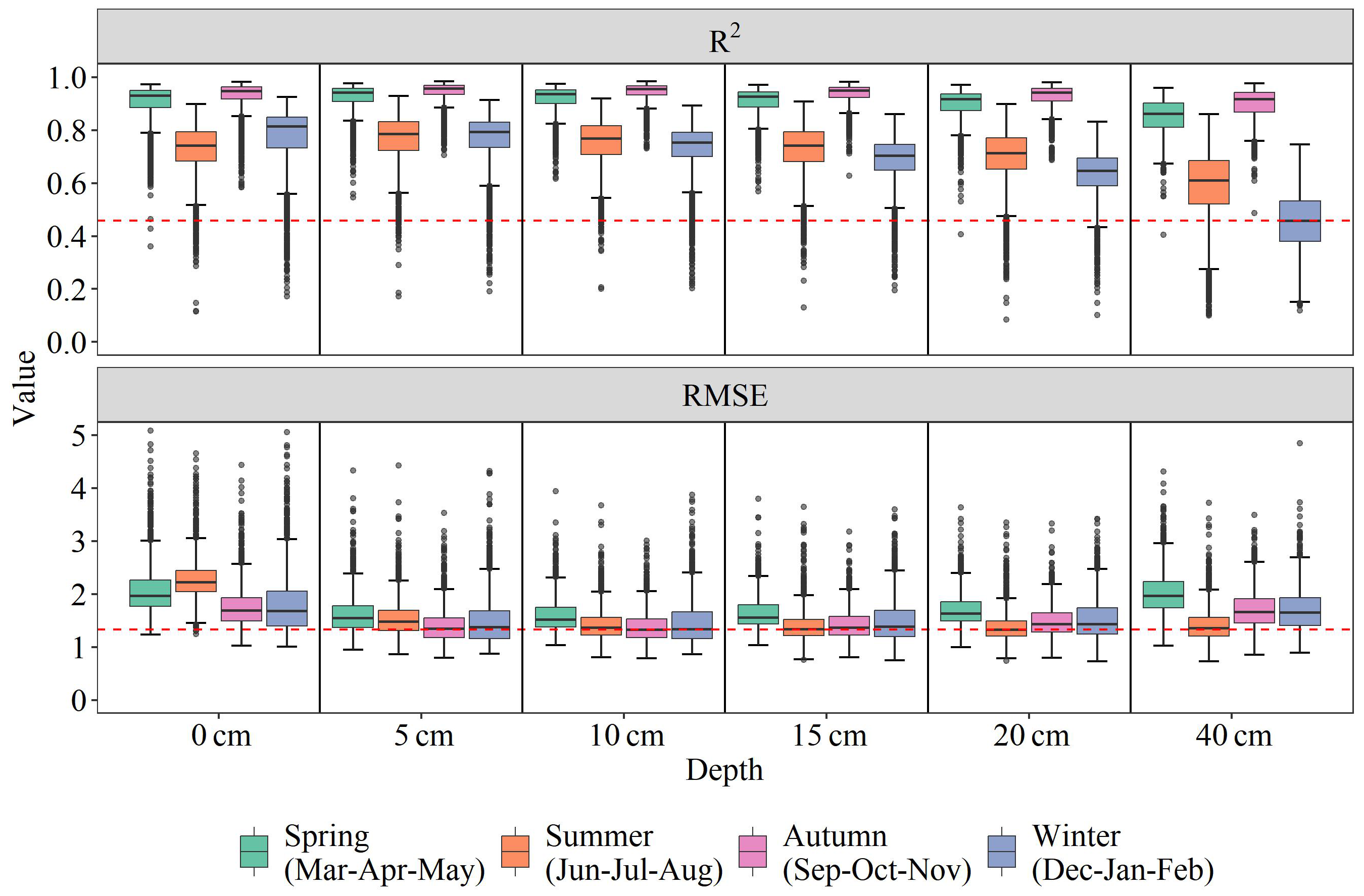 Furthermore, seasonal variations in prediction accuracy are shown in Fig. 8. The median R2 values across depths range from 0.48 to 0.98, with higher values in spring (green) and autumn (pink) and lower values in summer (orange) and winter (blue), particularly at 20–40 cm depth. The median RMSE values range from approximately 1.3 to 2.2 K, being lower in spring and autumn and higher in summer and winter, with the largest median error observed at 40 cm depth in winter. With increasing depth, the median errors decrease from the surface (0 cm) to 5–10 cm, and then gradually accumulate from 15 to 40 cm.