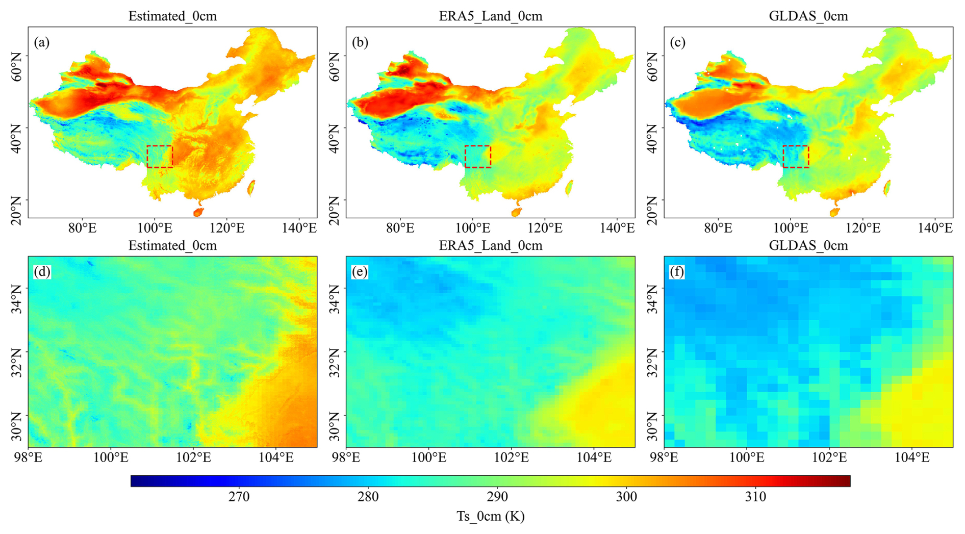Figure 9 presents a comparison of the Ts products at the 0 cm depth with the ERA5-Land and GLDAS 2.1 reanalysis datasets, including both national-scale patterns (Fig. 9a–c) and zoomed-in regional details (Fig. 9d–f). Compared with the two reanalysis products, our generated Ts dataset exhibits substantially finer spatial resolution, enabling a clearer representation of localized spatial heterogeneity. As illustrated in the zoomed-in panels of Fig. 9, our Ts product accurately captures terrain- and elevation-driven temperature gradients in regions with strong topographic variability, such as the transition zone from the Sichuan Basin to the margins of the QTP. In contrast, the coarse spatial resolution of ERA5-Land and GLDAS 2.1 tends to smooth out these fine-scale topographic effects, resulting in a loss of spatial detail.